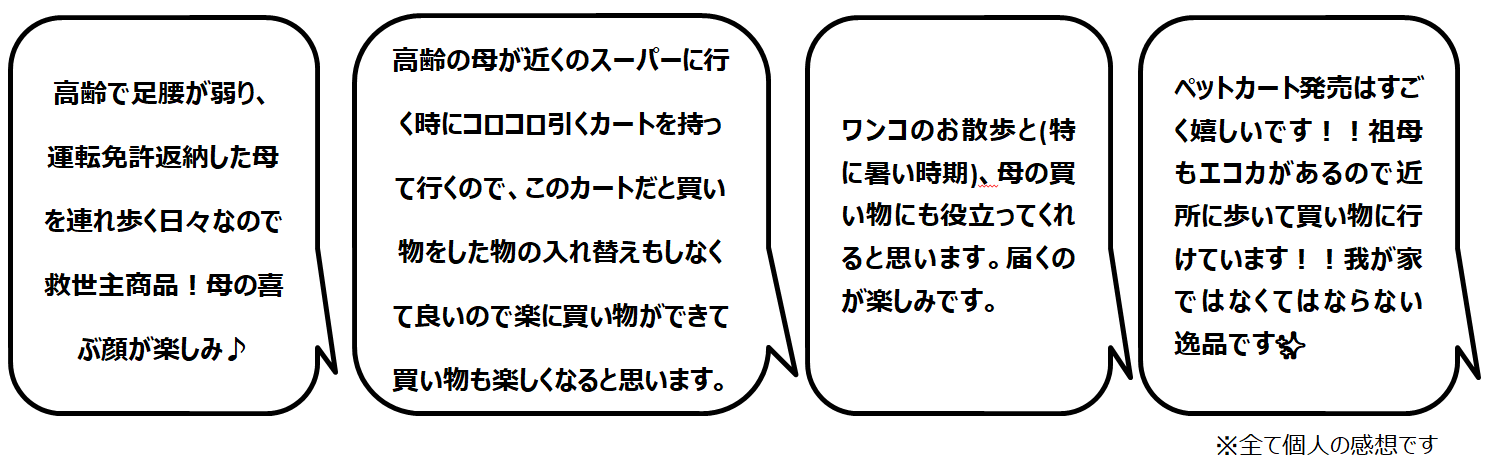 『EcoCaプレミア』・『EcoCaペットカート』は、クラウドファンディングMakuakeでの先行販売を行い、そこで聞かれたお声には、本商品が「お買い物にも、ペットのお散歩にも、母へのプレゼントにも使えて便利」というお声が多くありました。