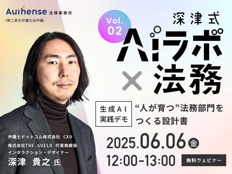 『深津式 AIラボ×法務』6/6(金)無料ウェビナー開催決定!第2回「生成AI実践デモ “人が育つ”法務部門をつくる設計書」|Authense法律事務所