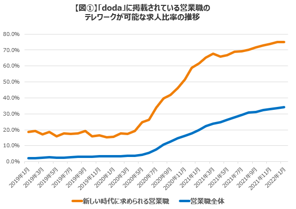 「doda」に掲載されている“新しい時代に求められる営業職” ※4のテレワークが可能な求人比率を2019年1月と2022年1月で比較すると、約4倍上昇していることが分かりました(【図①】参照)。これは、2019年当時はWeb会議システムや契約書類の電子捺印などに伴う新たなシステムの導入が進んでおらず、出社しないと仕事が円滑に進められない状況があった中で、ノウハウが蓄積されていき、テレワークでも十分に能力が発揮できる状況が整備されてきたことに加え、オンラインツールを用いて顧客と接する「インサイドセールス」や「カスタマーサクセス」職はテレワークと親和性が高い仕事内容だったからだと考えられます。2019年1月度はテレワークが可能な求人比率は18.8%と低い状況でしたが、2022年1月では75.1%と飛躍的に上昇しています。