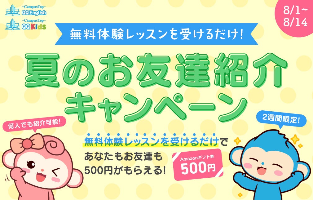 株式会社QQEnglish (本社:東京都渋谷区、代表取締役:藤岡 頼光)は、提供するオンライン英会話サービス「QQEnglish」「QQキッズ」にて、2024年8月1日(木)より「夏のお友達紹介キャンペーン」を開始したことをお知らせいたします。