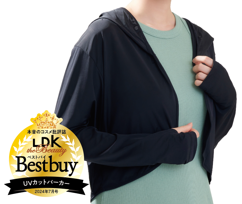アイスボレロは紫外線を防いでくれるほか、接触冷感素材で羽織るとひんやり!首元は2段階ホックで、隠す範囲を調節できます。持ち歩きやすい薄手素材で、日射しが気になったらサッと羽織るだけでOK。合わせる服も選ばず活躍します。