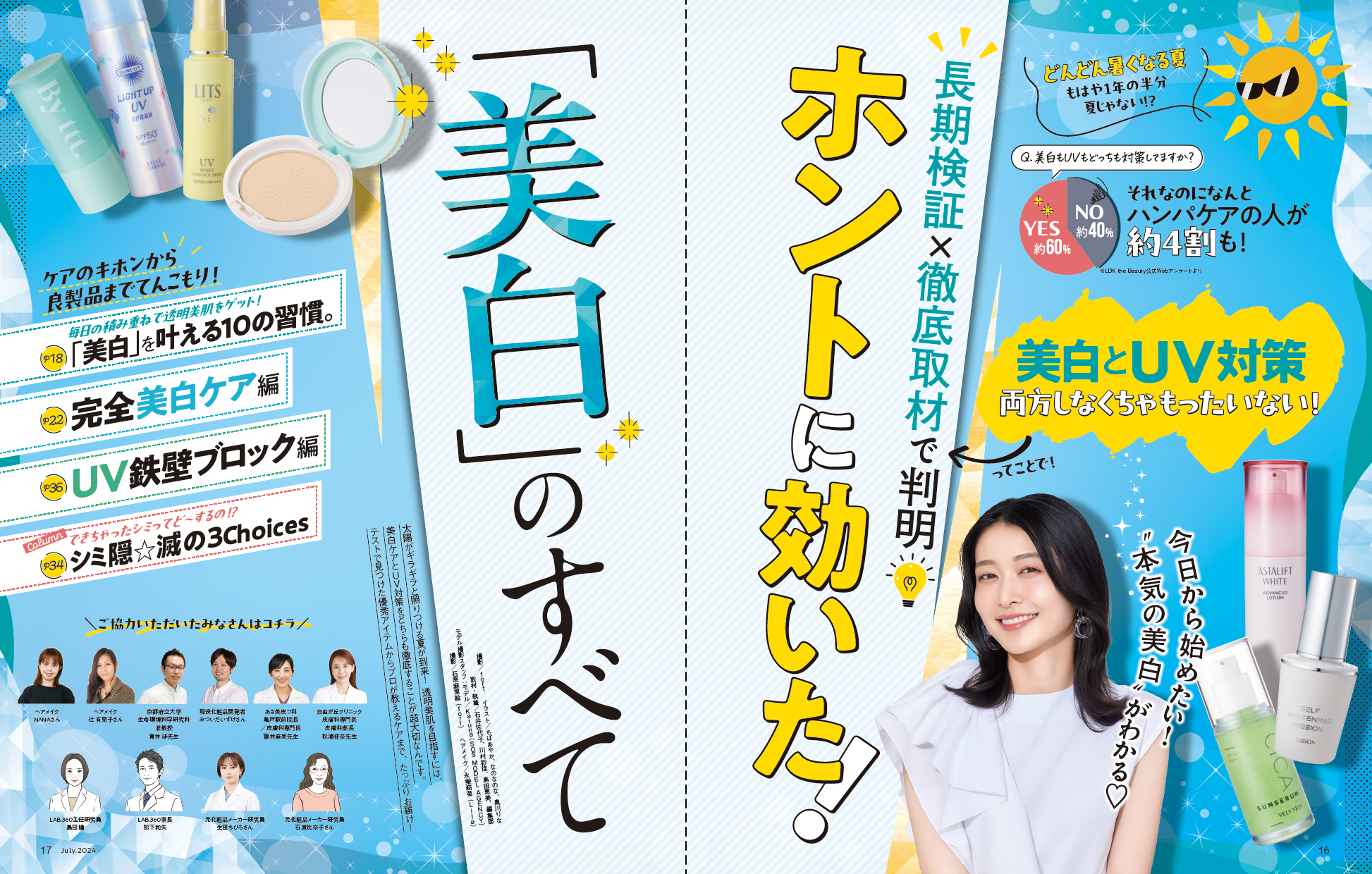 太陽がギラギラと照りつける夏が到来!透明美肌を目指すには、美白ケアとUV対策をどちらも徹底することが超大切なんです。テストで見つけた優秀アイテムからプロが教えるケアまで、たっぷりお届け!