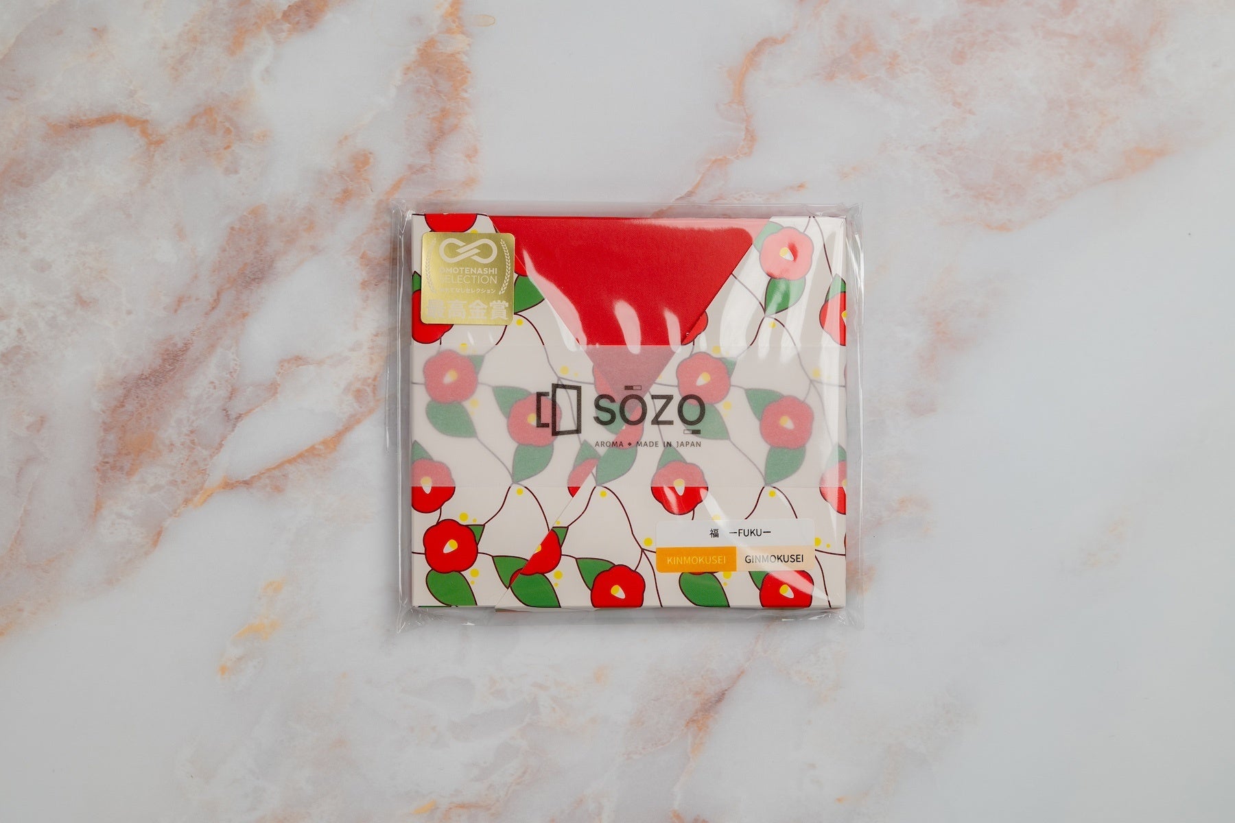 1本で2種類の香りを楽しむことができるお香。甘く濃厚でフルーティーな金木犀の香りと、ほのかな甘みと清涼感のある銀木犀の香りを組合せた<福ーFUKU->。