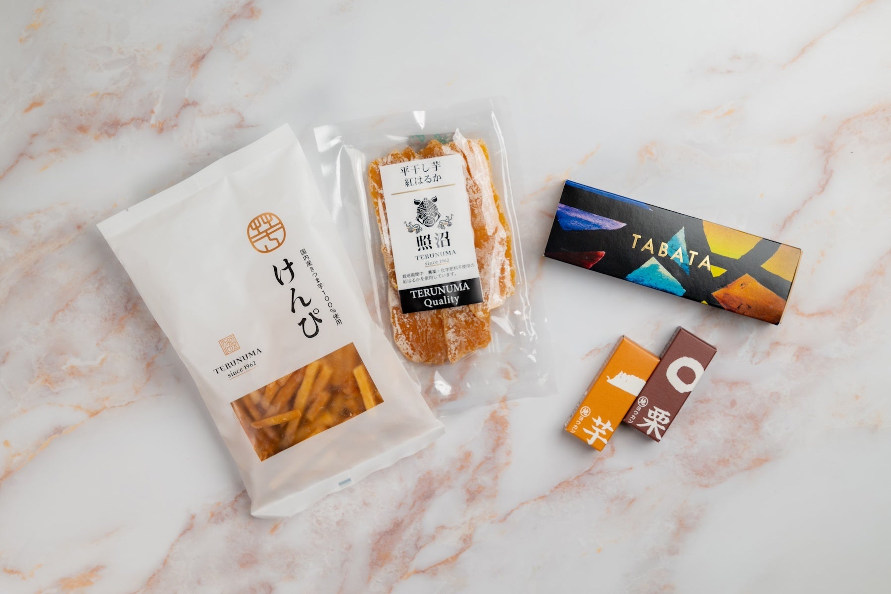 生姜、柚子胡椒、実山椒など和製スパイスが効いたフロランタン「TABATA」をはじめ、日本人に愛されてきた“芋スイーツ”や“ようかん”をセットに。
