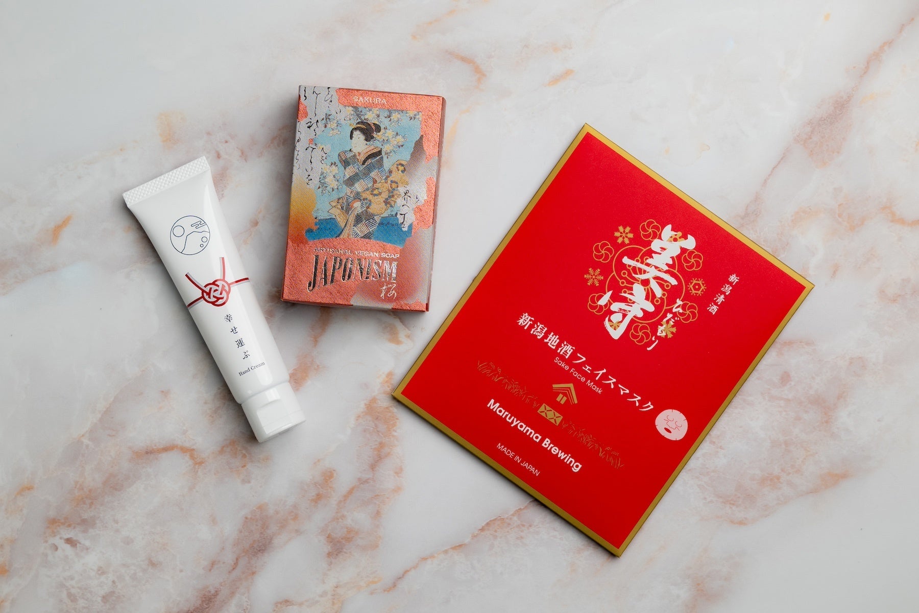 「桜」「ゆず」「抹茶」など日本の伝統的な素材と現代のデザインが融合した石鹸、新潟県内11の酒蔵による日本酒のフェイスマスク、“お浄め”をテーマとする自然派ハンドクリームの3点セット。