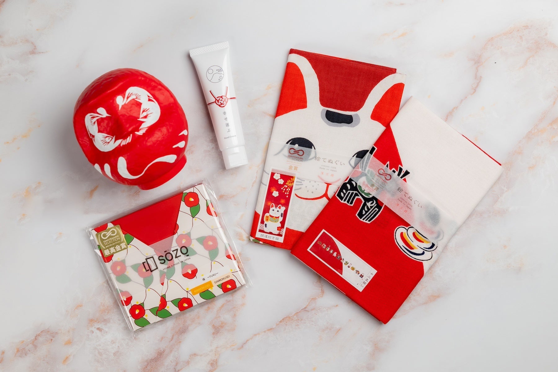 お正月にぴったりな“福”アイテムの詰め合わせ。“だるま”、“手ぬぐい”、“お香”に“お浄めコスメ”、どの商品も見た目の華やかさはもちろん、伝統的な日本文化を感じることができる、この季節にぴったりのアイテムをセレクトしました。また、セット商品は全て、日本の優れた商品を世界に発信するプログラム「OMOTENASHI Selection」を受賞した商品です。