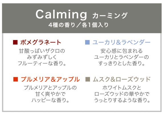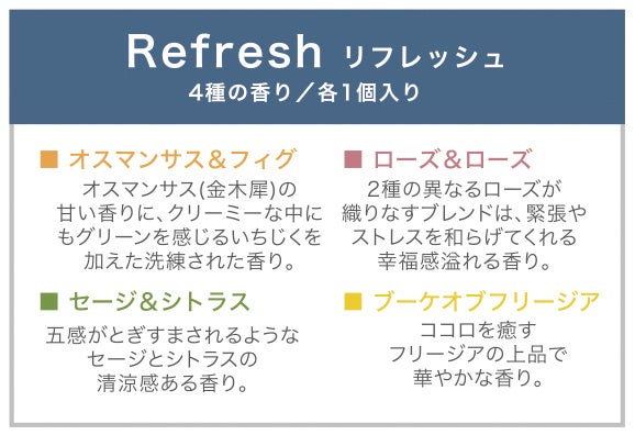 「香るキャンドル」シリーズの8種の香りをお試しいただける、リフレッシュとカーミングの2種類をご用意しました。
