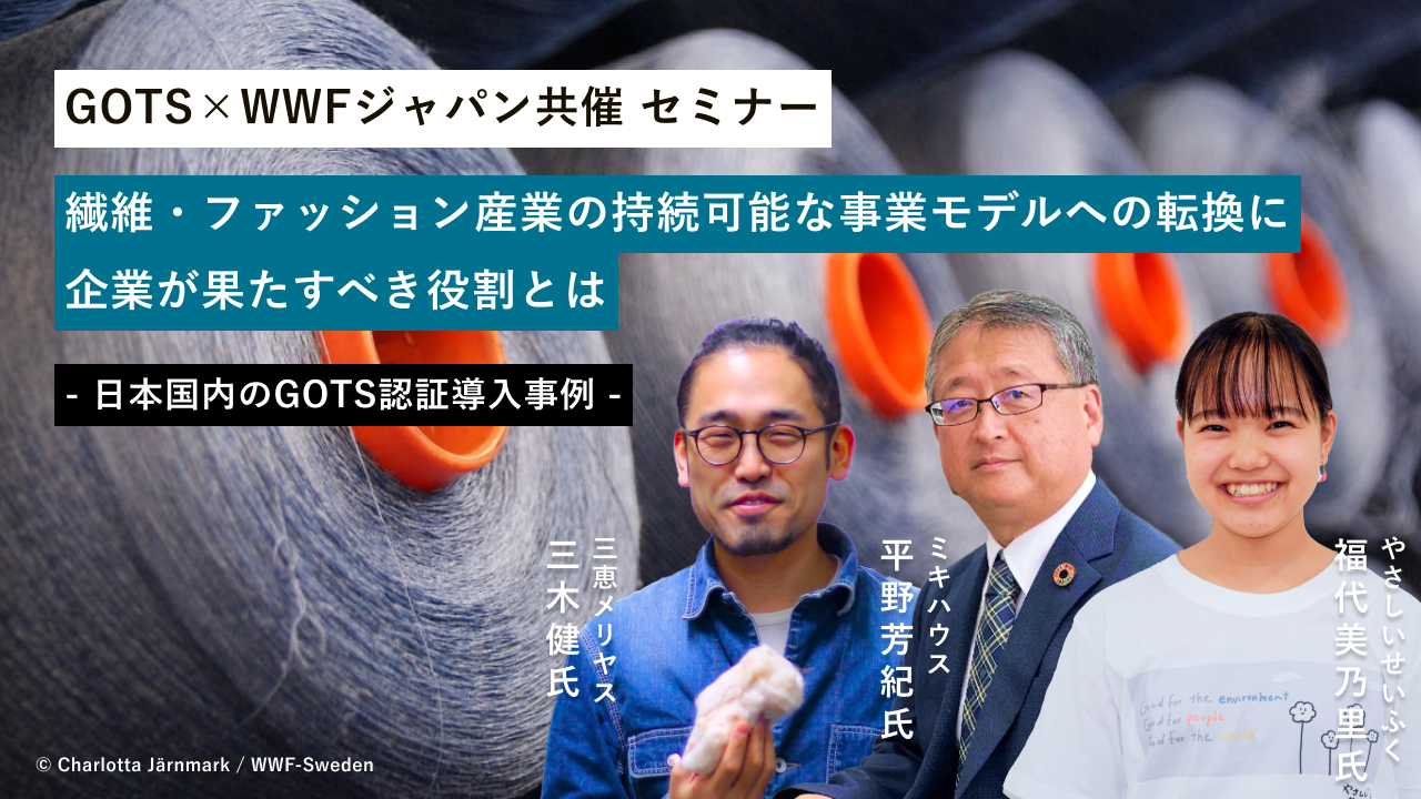 WWFジャパンは、2024年6月5日(水)、オーガニック繊維のリーディングスタンダードであるGlobal Organic Textile Standard(本部:ドイツ、ジャパン・リプレゼンタティブ:松本フィオナ、以下GOTS)と共同で都内にてセミナーを開催します。ゲストスピーカーに、ミキハウスを展開する三起商行株式会社 平野芳紀氏(ESG推進部 執行役員)、そして今回の動画に出演いただいた三恵メリヤス株式会社 三木健氏(専務取締役)をお迎えし、GOTS認証導入背景やサステナビリティの取り組みについて語っていただきます。また、同じく動画に出演いただいた学生団体「やさしいせいふく」代表 福代美乃里氏には、服の生産者に想いを馳せる学生たちの取り組みについてお話いただきます。