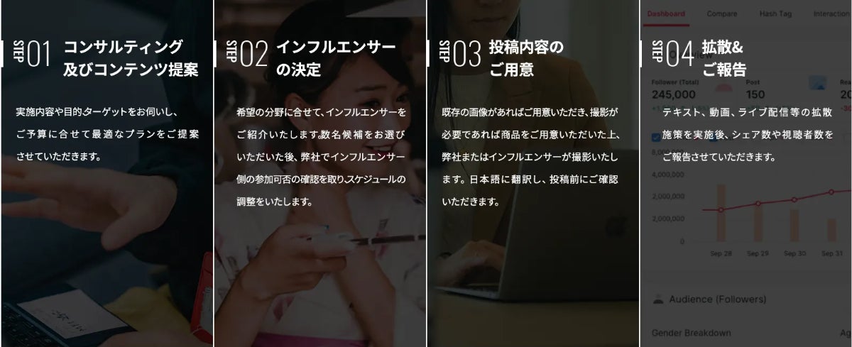 そこで、年間数千件を超えるマーケティング支援実績のある当社が持つ、アジアを中心とした現地事情の専門性及びデータを基にしたインフルエンサーマーケティングの強みと、ENGAWAの持つ、欧米豪を中心とした日本の企業・地域・自治体向けの豊富な越境マーケティングのノウハウを掛け合わせて、提供するのが今回のサービスです。