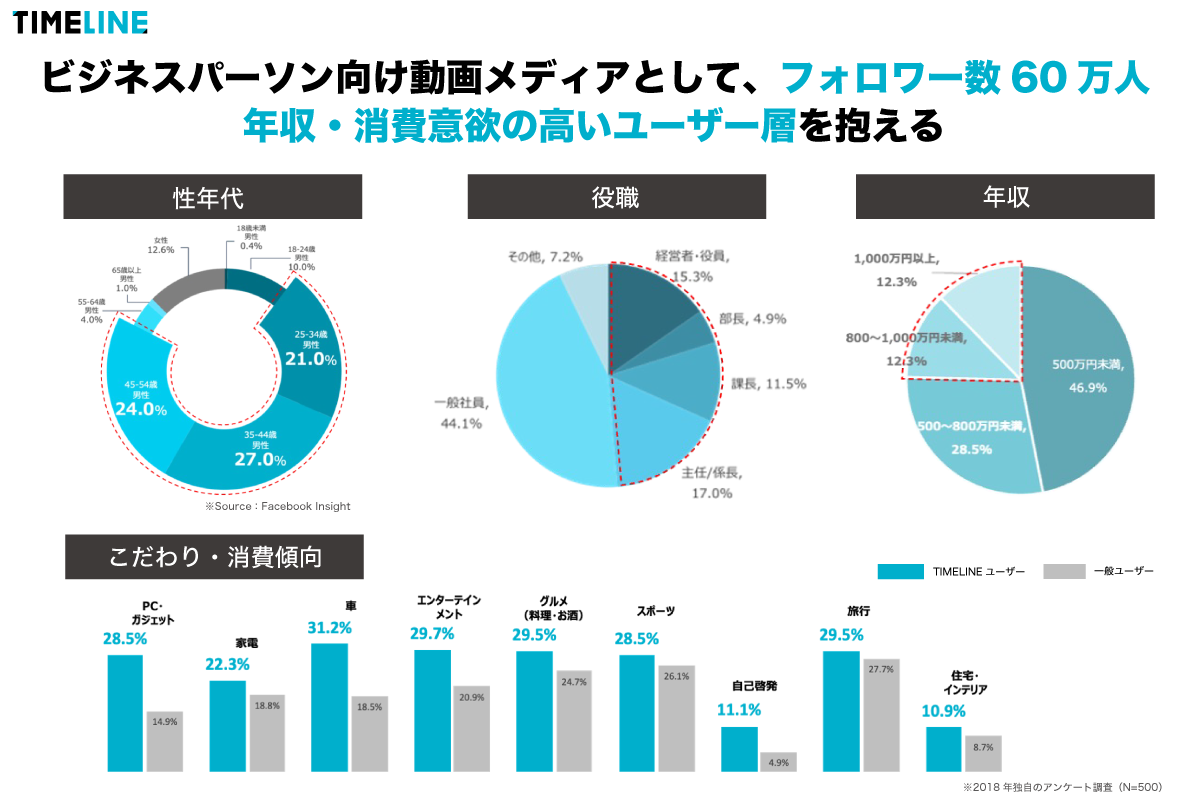 制作した動画は、ビジネスパーソン向け動画メディア『TIMELINE』で配信します。SNSファン数60万人、月間リーチ数1,000万人を超えるメディア力で集客支援が期待できます。