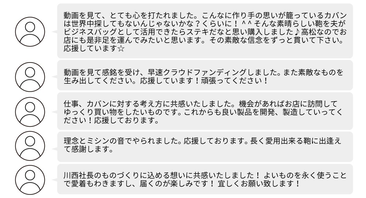 | 制作いただいた動画のクオリティが高く、かばんの特性や工房の雰囲気までわかりやすく伝えることができました。『TIMELINE』での動画拡散に加えて、広告運用を通じてもアクセス数を伸ばすことができ、最終的には大きな成果に繋がりました! また、終了後のレポートもどんな人にどれくらい興味を持ってもらい、実際に購買に至ったのか詳細なフィードバックをいただけて非常に参考になりました。『TIMELINE クラウドファンディング』に参加して本当によかったので、また別のプロジェクトでも掲載をお願いしたいと思っています。 |