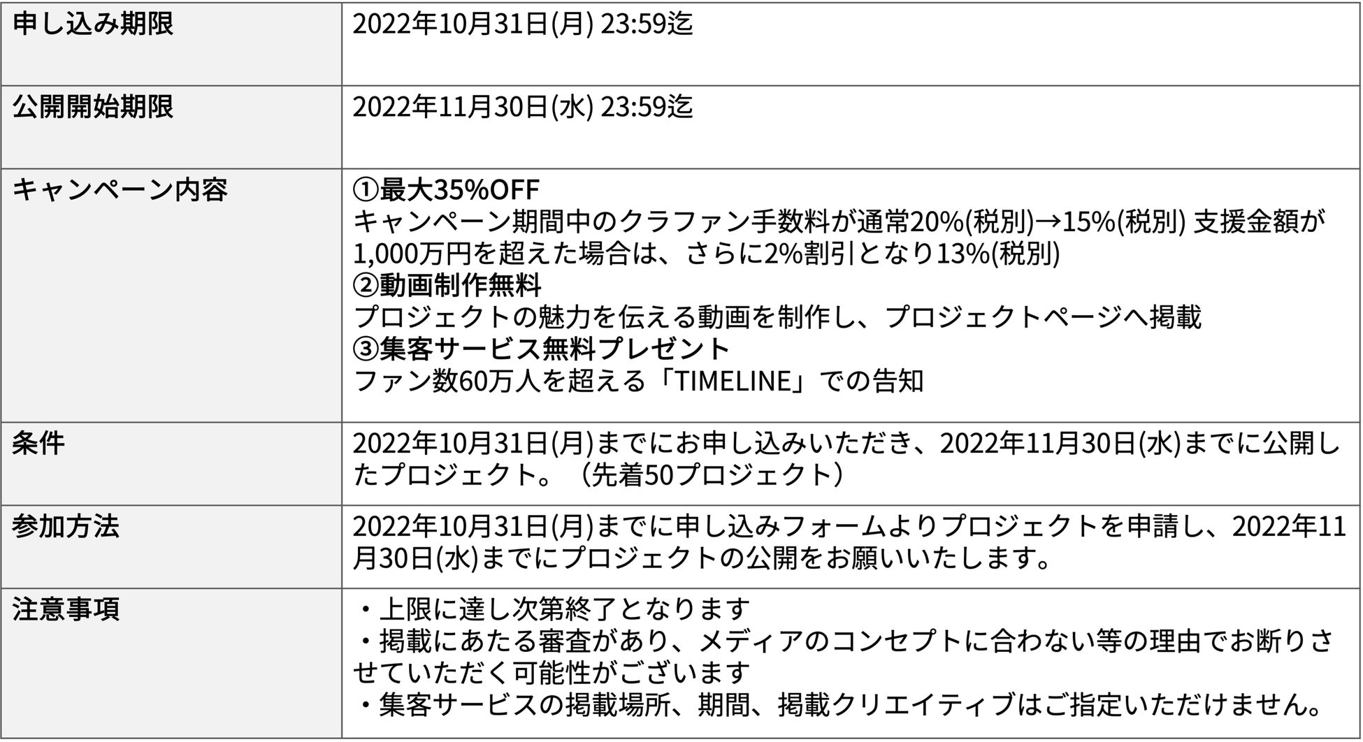 株式会社エブリー(本社:東京都港区、代表取締役:吉田 大成)が運営する『TIMELINE クラウドファンディング』は、本日から10月31日までのキャンペーン期間中にお申し込みいただいた先着50プロジェクトについて、掲載手数料が最大35%オフになるキャンペーンを実施します。さらに、プロジェクトの魅力を伝える動画制作、集客サービスとしてSNSファン数60万人を超えるビジネスパーソン向け動画メディア『TIMELINE』での動画配信と運用型広告10万円分を全て無料でプレゼントいたします。