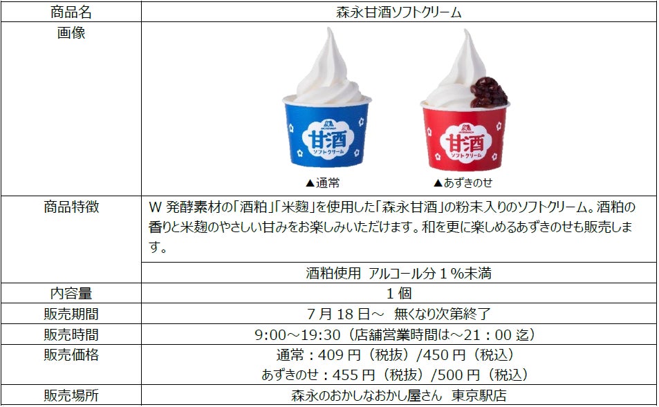また、7月18日から「森永のおかしなおかし屋さん」では期間限定で、W発酵素材の「酒粕」「米麴」を使用した「森永甘酒」の粉末入り「森永甘酒ソフトクリーム」を販売いたします。
