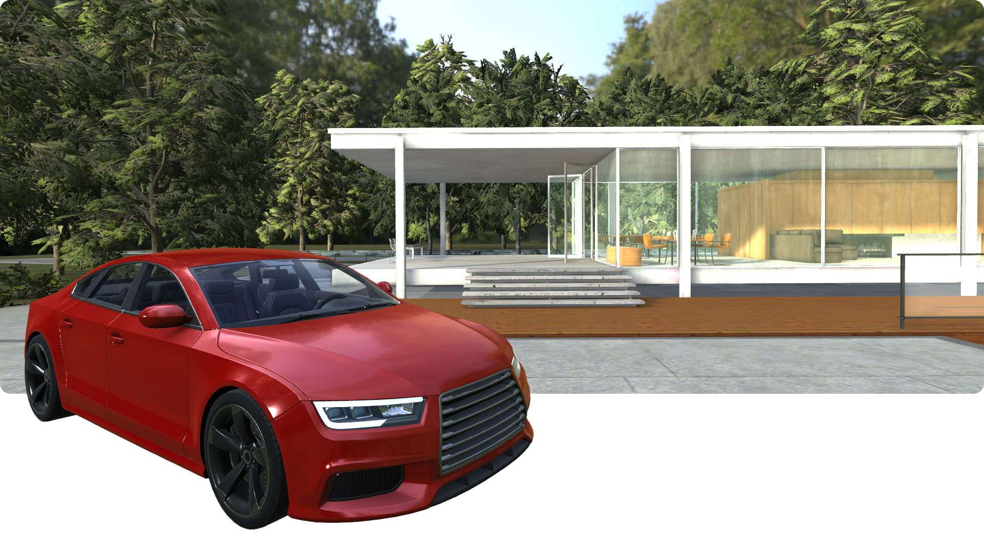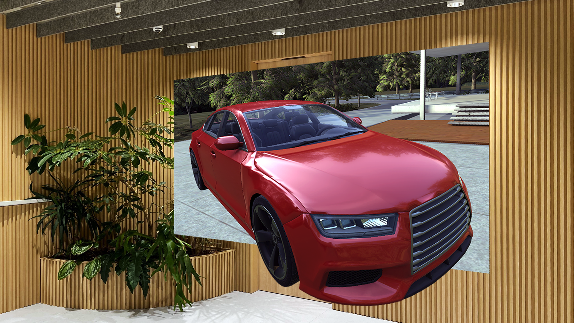 2Dの平面映像から、3Dオブジェクト(赤い車)が飛び出すような表現
