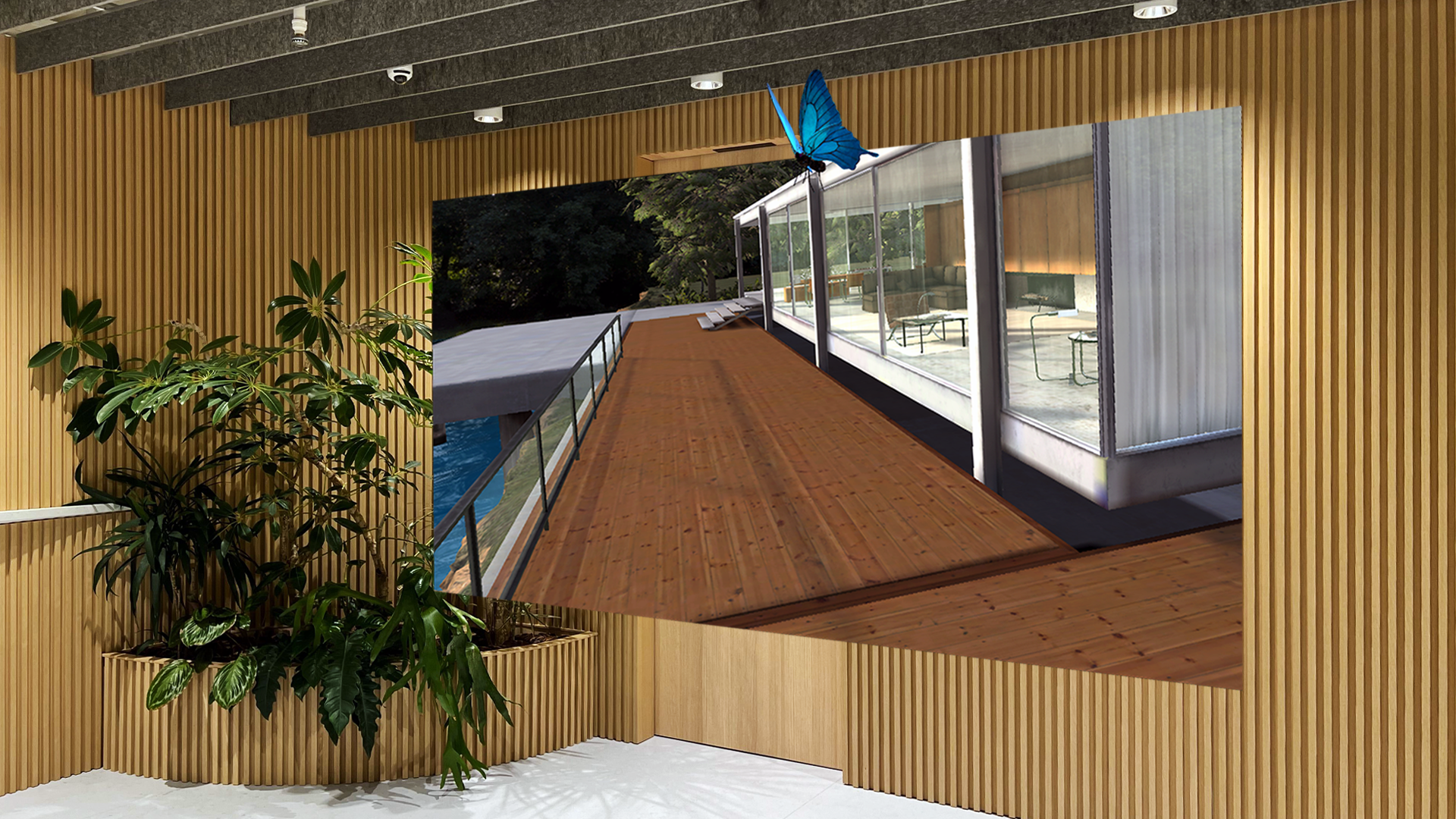 2Dスクリーン上で羽ばたいている蝶が、スクリーンを超えて現実世界に出てくるような表現