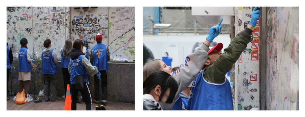 4日間にわたる活動では、1日あたり約100名、延べ400名の学生が参加。渋谷駅周辺のハチ公広場、センター街、道玄坂、恵比寿東口公園など、落書き被害が目立つエリアで作業を実施しました。