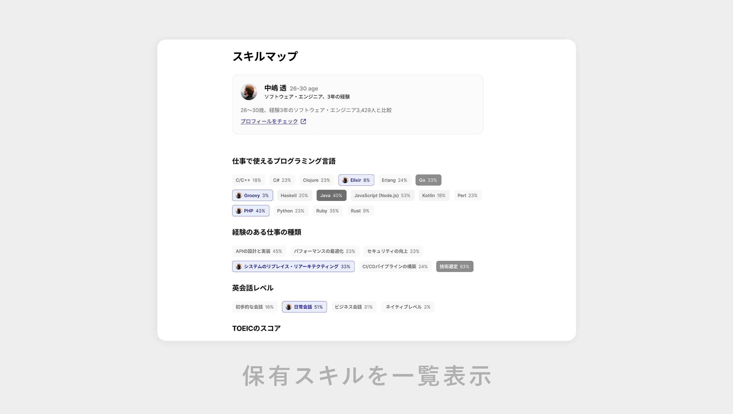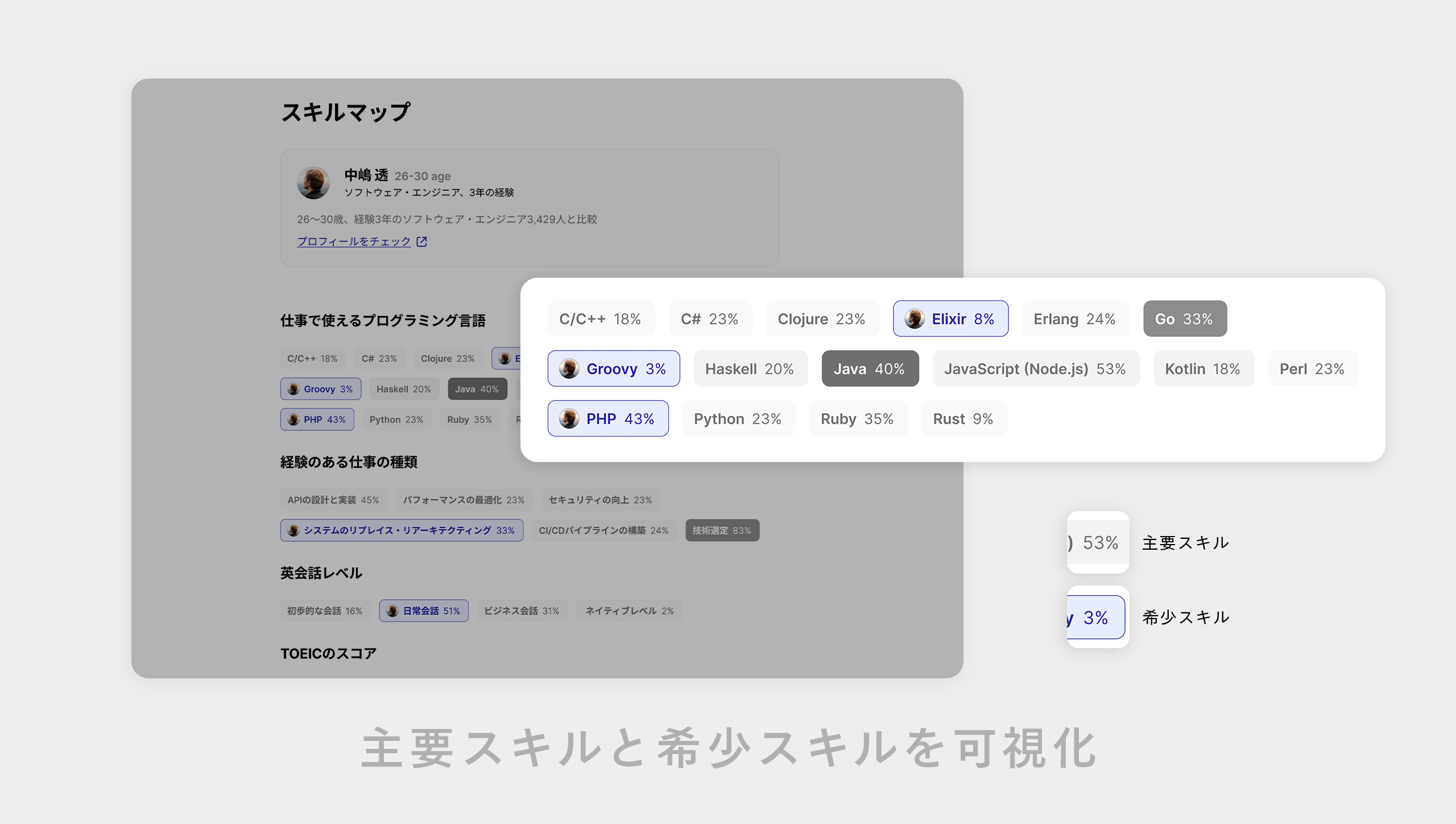 一覧では、保有しているスキルが一目瞭然になるほか、保有スキルの希少性も確認できます。スキルの希少性は、診断実施者と同年代・同職種のWantedlyユーザーとの診断結果の比較によって算出され、数値が高いと主要スキル、低いと希少スキルとなります。