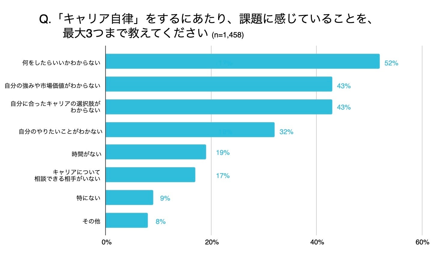 そんな中、当社が今年の10月にWantedlyユーザー(1,458人)を対象に実施した調査では、キャリア自律をするにあたって「自分の強みや市場価値がわからない(52%)」「自分に合ったキャリアの選択肢がわからない(43%)」といった悩みを抱えている方が一定数いることを確認しました。