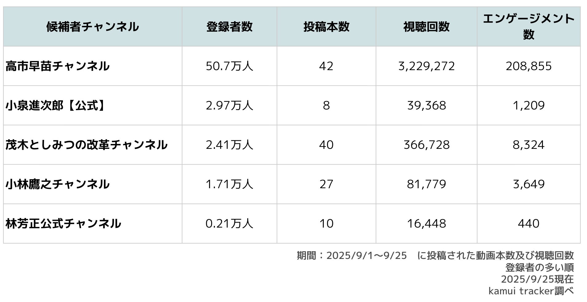また、2025年9月1日〜25日における投稿本数も42本と、茂木氏の40本と並び最多クラスであり、積極的な情報発信をYouTubeで行っていることがうかがえます。