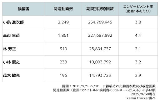 株式会社エビリー(本社:東京都渋谷区、代表取締役社長:中川恵介、以下エビリー)は、当社が提供するYouTubeデータ分析ツール『kamui tracker』を用い、2025年総裁選の各候補者について、公式YouTubeチャンネル、YouTube討論会に寄せられたコメント、そしてYouTube全体での関連動画の動向について統合的な分析を行いましたので、結果をお知らせいたします。
