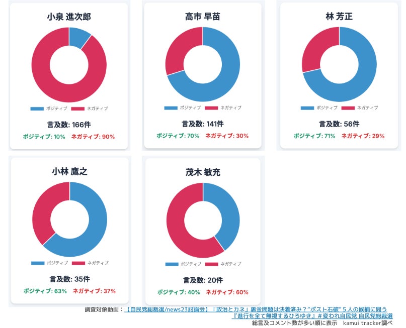 候補者5名が登壇した討論会の動画(コメント数が多い動画を2つピックアップ)に寄せられたコメントを分析したところ、国民の“本音”がより鮮明に浮かび上がりました。
