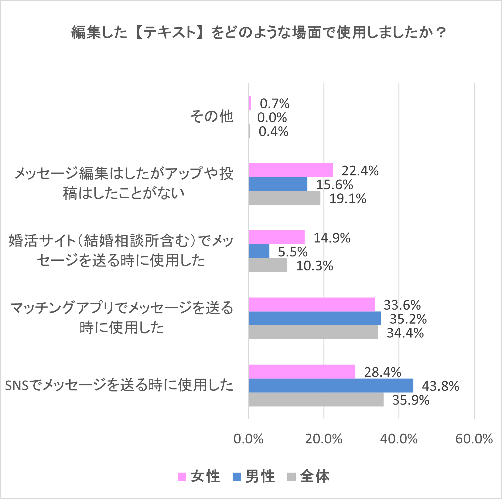 次の質問では【メッセージ】に関する加工・編集の利用経験について、どのようなシーンで利用したか質問しました。まず、男女全体の割合でみると、最も割合が高かったのは「SNSでメッセージを送る時」で35.9%、次いで「マッチングアプリでメッセージを送る時」が34.4%という結果となりました。続いて「婚活サイト(結婚相談所含む)」が10.3%となり、19.1%は「編集・加工はやったもののアップや投稿はやっていない」という回答結果となりました。