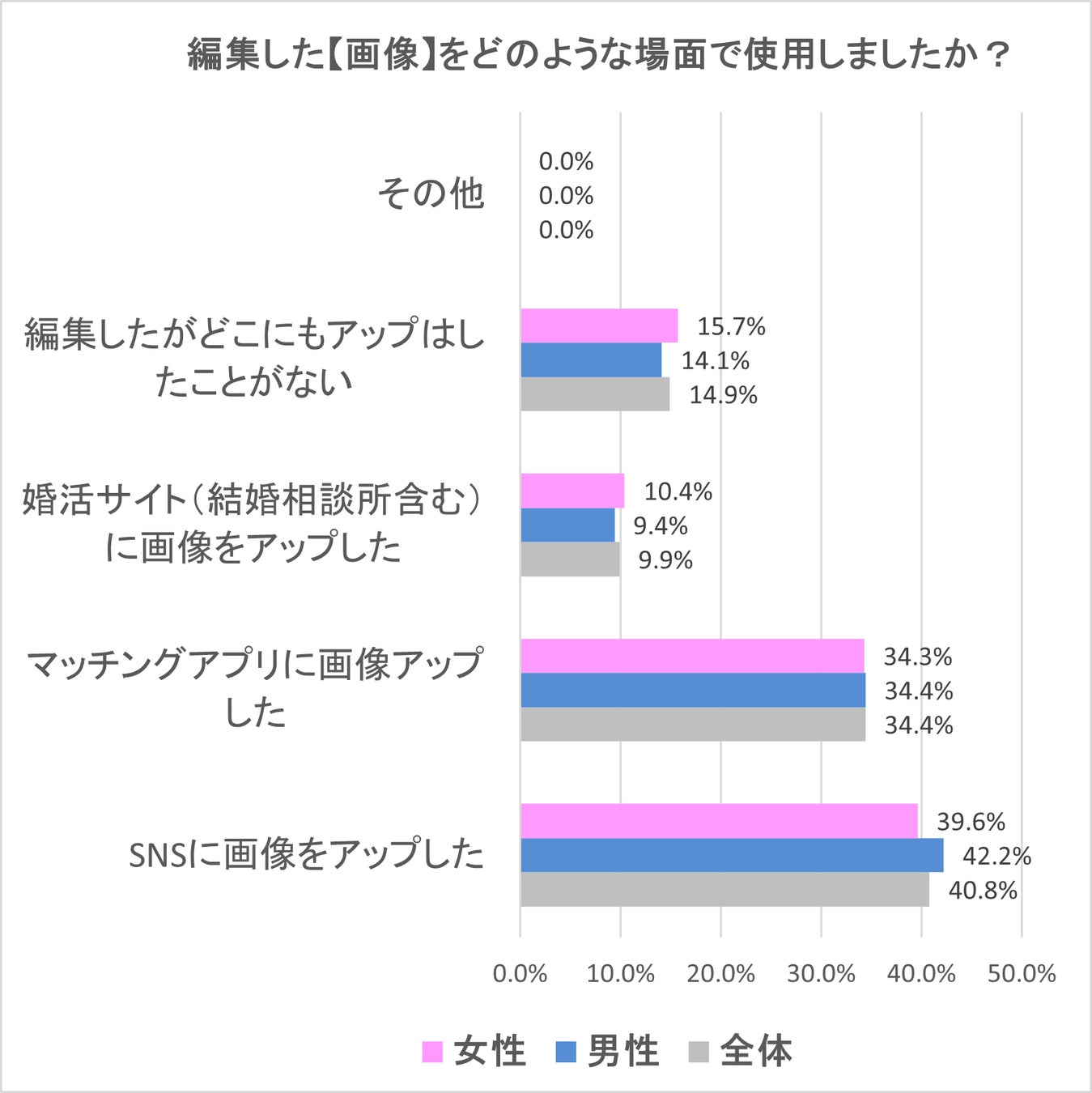 この質問では【画像】に関する加工・編集の利用経験について、どのようなシーンで利用したかを質問しました。この質問への回答に関しては、男女ともに殆ど差異のない結果となり、最も多かったのが編集・加工した【画像】を「SNSにアップした」という回答で、男女合計で40.8%という結果となりました。続いて多かったのが「マッチングアプリにアップした」が34.4%となり、SNSとマッチングアプリ両方に回答した合計では75.2%という結果となります。3番目が「婚活サイト(結婚相談所含む)」で9.9%となり、残り14.9%は「編集・加工はしたことはあるがアップ等はしなかった」という回答結果となりました。