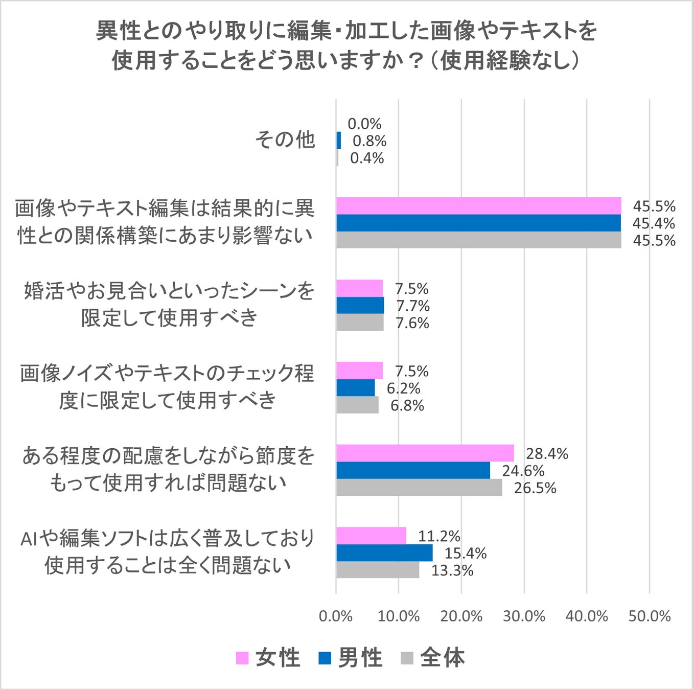 前述と全く同じ設問を、「これまで利用した経験がない」と回答した男女に質問したところ、一番多かった回答は、「AIや編集・加工ツールの利用は異性との関係性構築に影響はない」と回答した割合が、じつに45.5%と約半数近くとなり、シーンや利用方法の限定的な許容を含めたそれ以外の合計割合54.5%とほぼ同じ回答割合となりました。ご自身の経験からAIや編集ツールを使用しなくても異性との出会いや恋愛に影響なく結婚に至ったという経験がこの回答結果に表れていることがわかる結果となりました。