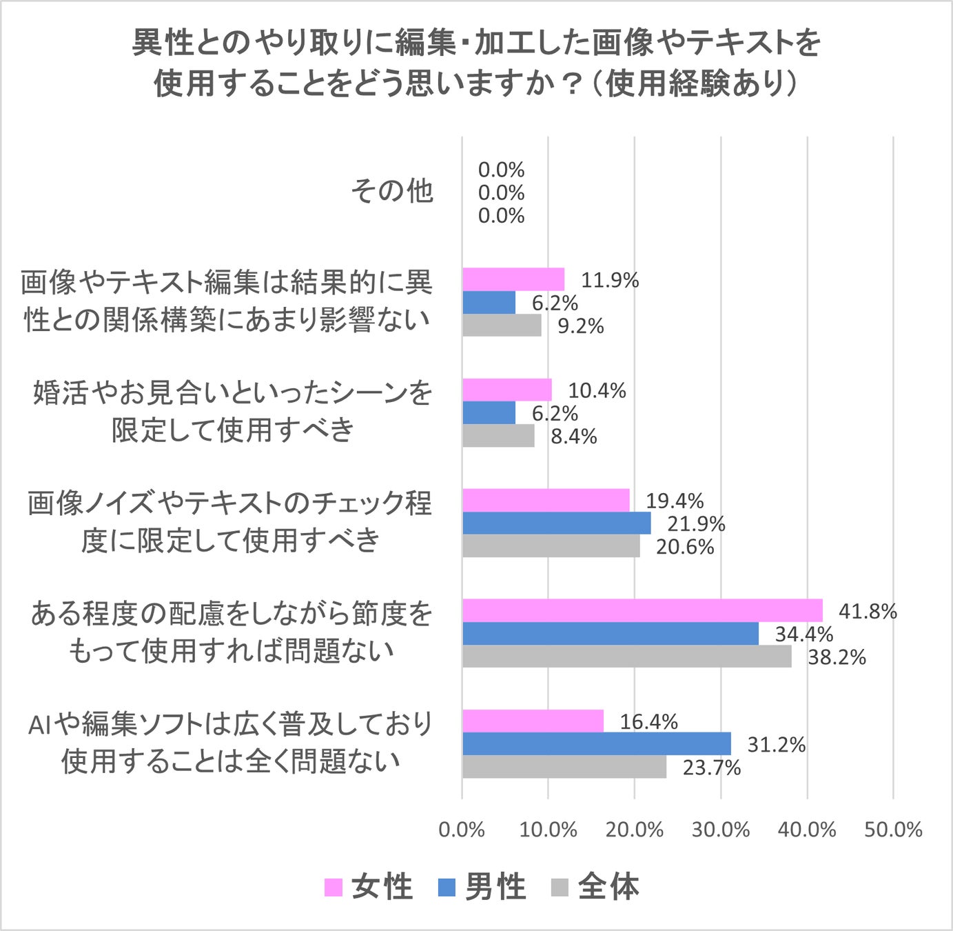 この設問では結婚するまでに利用経験が「ある」と回答した男女に、「異性とのコミュニケーションにおいて、AIや編集ツールを利用することについてどう思う?」ということを質問しました。全体で最も多かった回答は、「節度をもって利用すれば問題ない」が38.2%、次いで「広く普及しているのだから使用は全く問題ない」が23.7%、3番目に多かったのが「ノイズ除去やエラーチェック程度に限定して使用すべき」が20.6%という結果となりました。「婚活やお見合いといったシーンを限定して使用すべき」の8.4%を含めると、全体で90.8%が、シーンや活用方法を限定して利用することを含めて、利用することを許容するという回答結果となりました。一方、「AIや編集ツールの利用は異性との関係性構築に影響はない」という回答は9.2%で、全体の1割程度という結果となりました。
