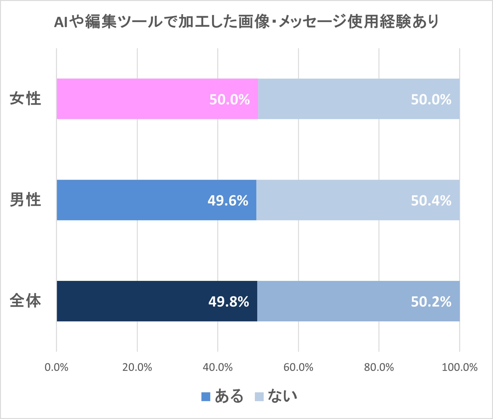 まず、「ご自身の写真(撮影時または撮影後)やテキストメッセージ(作成時または作成後)に、AIや編集加工ツール等を使用したことがありますか?」という質問に対する回答結果は、男性の49.6%、女性の50.0%が「あり」という結果となりました。