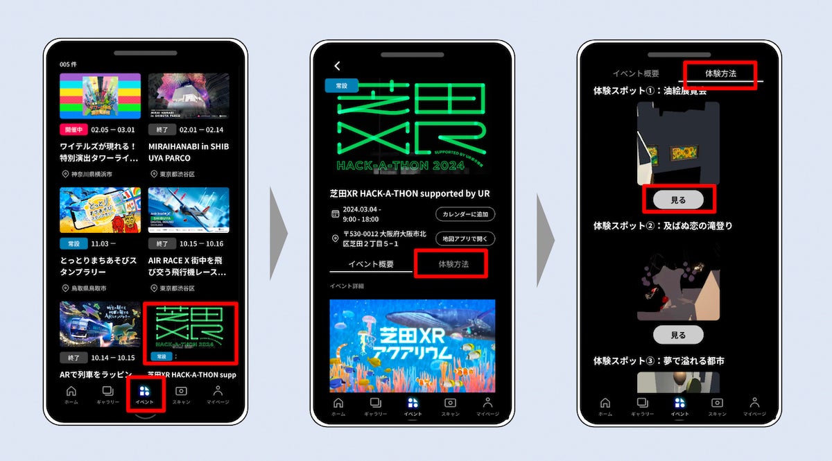 ①STYLYモバイルアプリケーション「イベント」タブをタップし、「芝田XR HACK-A-THON supported by UR」をご選択ください。