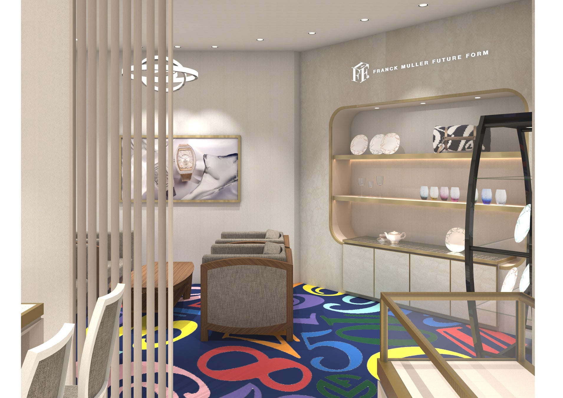サロンは、フランク ミュラーが掲げる“時の哲学”を空間全体で表現。曲線美を基調とした設えと、落ち着きと気品を兼ね備えたインテリアにより、コレクション一つひとつの個性と価値を丁寧に引き立てます。最新作から定番モデルまでをゆったりとご覧いただけるほか、経験豊かなスタッフによるきめ細やかなご案内を通じて、ブランドの奥深さに触れていただける場となっています。