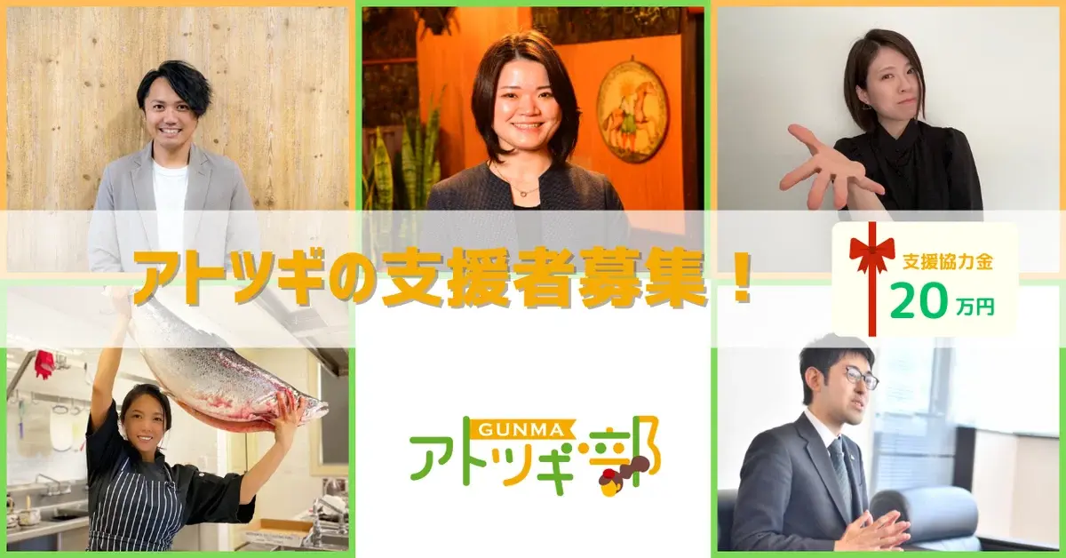 昨年度から群馬県内の後継者イノベーション事業として始まった「GUNMAアトツギ部」。今年は5名の個性豊かな、熱意あふれる5名のアトツギの参加が決定しました。この度、5名のアトツギの支援をしてくださる方を募集開始いたしましたのでお知らせいたします。