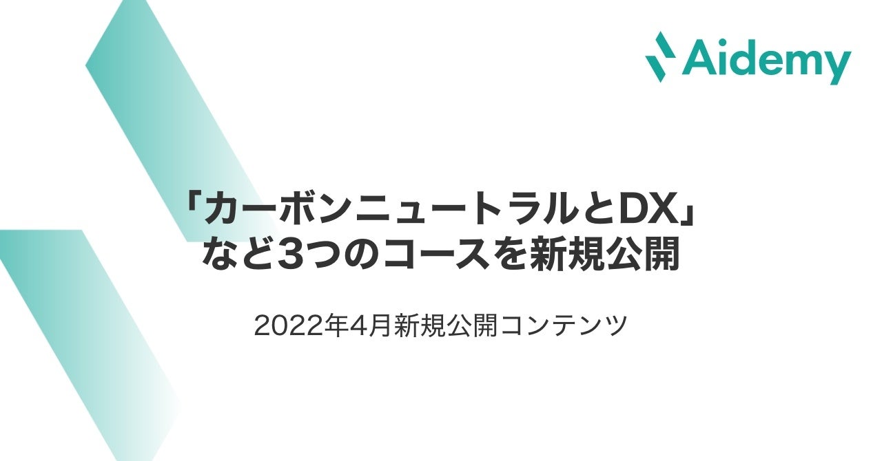 AIを中心としたDX人材・GX人材の育成から実運用まで一気通貫で支援する株式会社アイデミー(本社:東京都千代田区、代表取締役執行役員 社長CEO 石川聡彦、以下「アイデミー」)は、2022年4月の新規公開コンテンツとして「カーボンニュートラルとDX」「画像データの異常検知:入門編」「画像データの異常検知:実践編」の提供を開始いたしました。