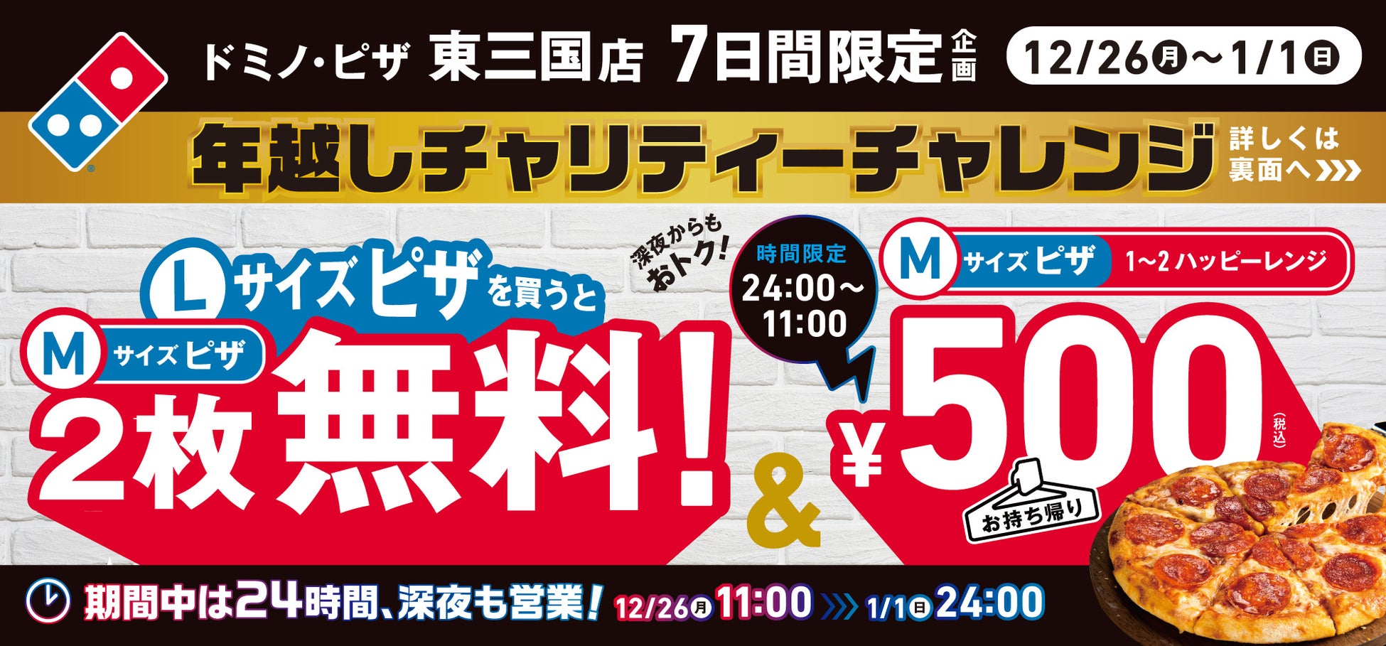 【ドミノ・ピザ史上初・前代未聞・空前絶後の目白押し!】ドミノ・ピザ東三国店限定「年越しチャリティーチャレンジ」本日スタート!(12月26日午前11時から1月2日午前11時まで限定)