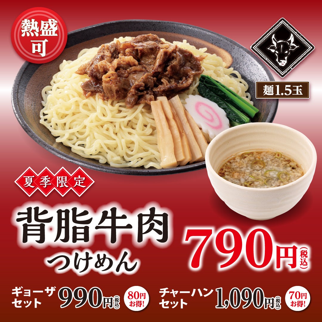 「激辛マーラーつけめん」は、ギョーザセット890円(税込)、チャーハンセット990円(税込)のご注文で、さらにお得にお楽しみいただけます。また、「背脂牛肉つけめん」にも、お得なギョーザセット990円(税込)、チャーハンセット1,090円(税込)をご用意しております。