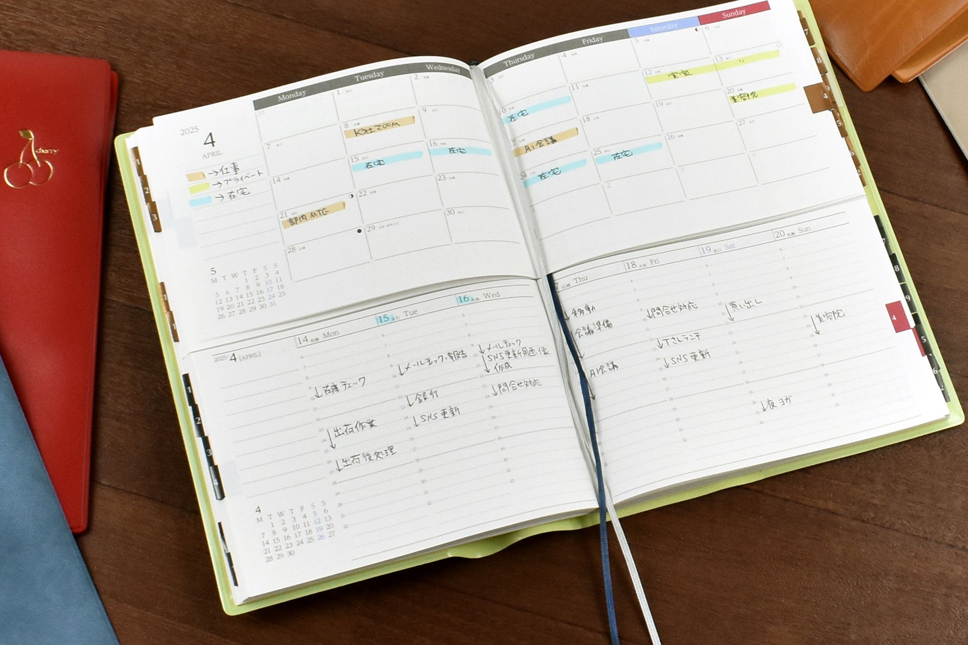 手帳を開くと、ページが真ん中で上下に分割され、上段と下段それぞれを別々にめくれるようになっています。例えば上段の月間予定を見ながら、下段に詳細予定を書くことが可能です。