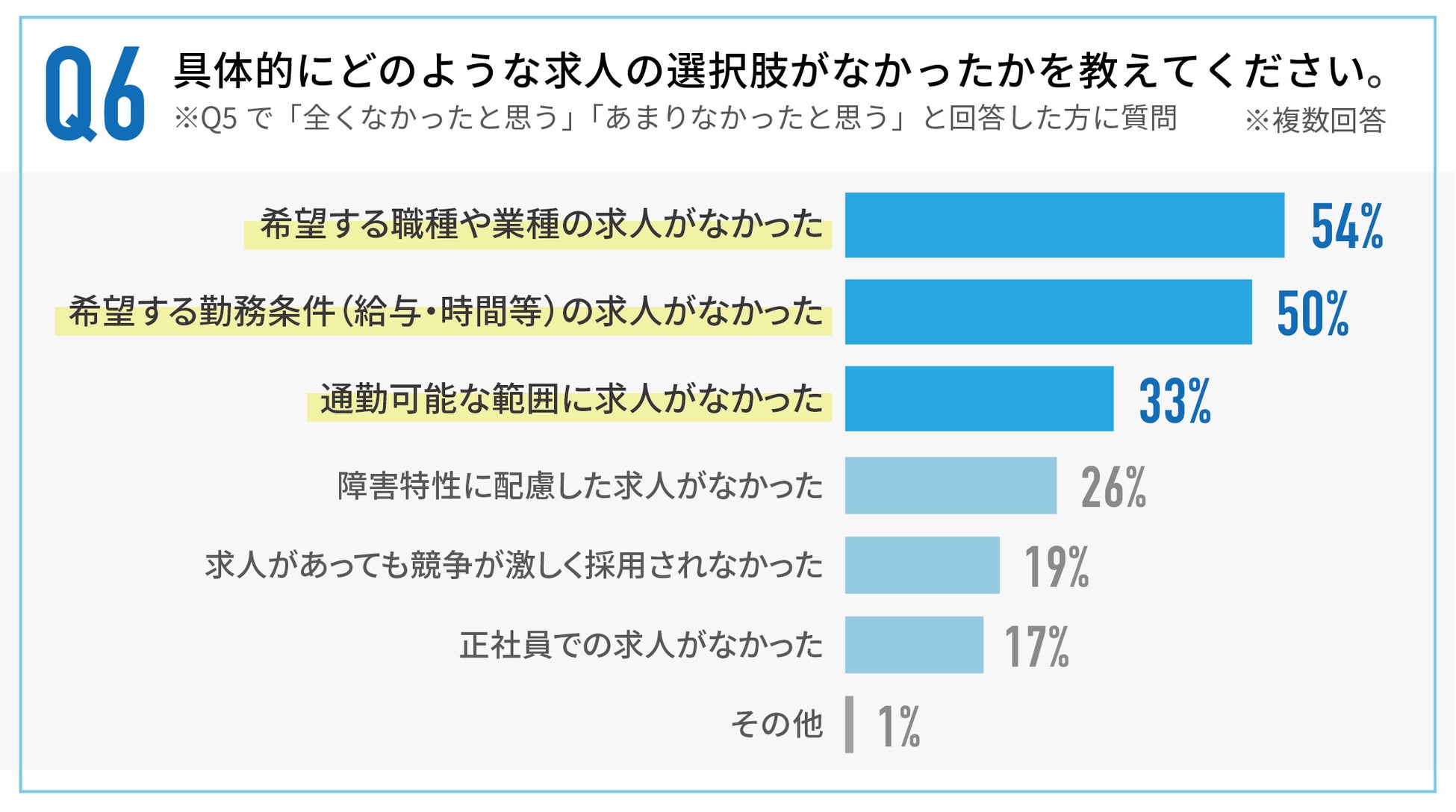 「希望する職種や業種がなかった」(54%)、「希望する勤務条件がなかった」(50%)が上位。「障害特性に配慮した求人がなかった」とする回答も26%あり、企業側の理解不足が背景にあります。