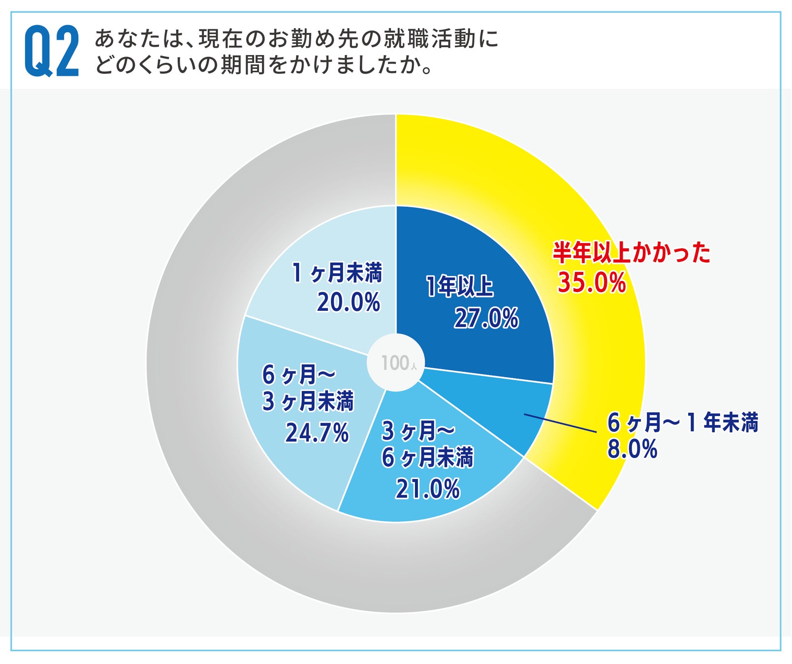 「1年以上かかった」が27.0%で最多、半年以上かかった人は約3割に上ります。求人の選択肢が少なく、希望条件に合う職場を見つけるまでに時間がかかる傾向があることが明らかになりました。