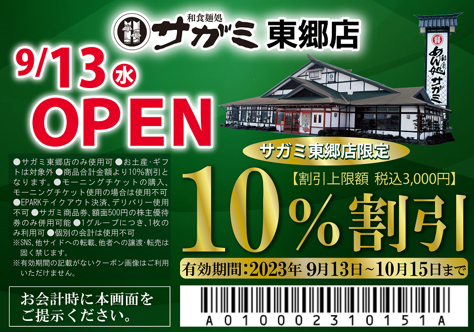 愛知県愛知郡東郷町には、「和食麺処サガミ東郷店」が2009年2月に閉店して以来の再出店となります。