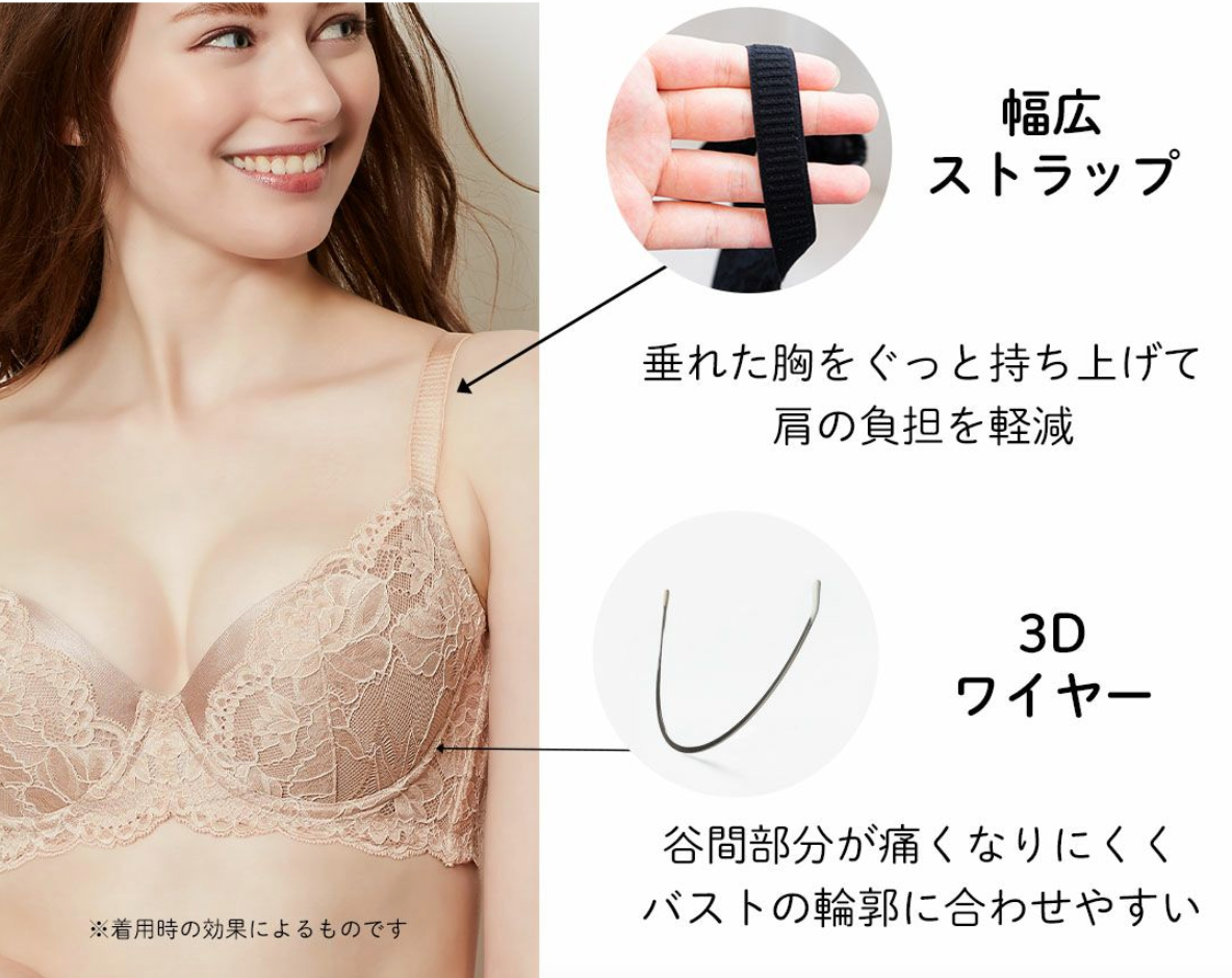 さらに、HEAVEN Japanが独自に開発した「3Dワイヤー」がバストの輪郭に優しくフィット。谷間部分にワイヤーが当たりにくく、着用中に痛みを感じることがありません。また幅広のストラップでバストをぐっと持ち上げることで、痛くなったり凝りやすい肩の負担も軽減されるように工夫しています。
