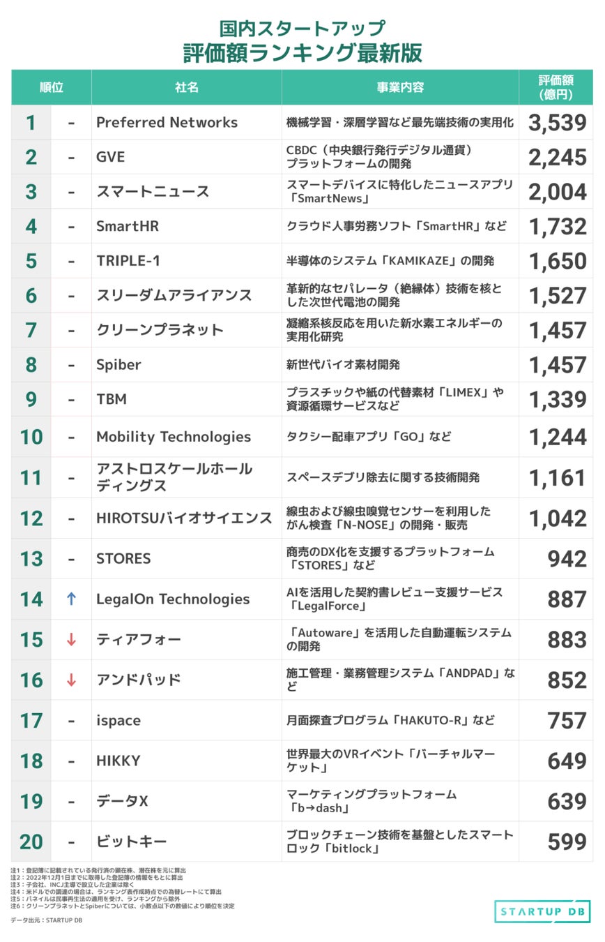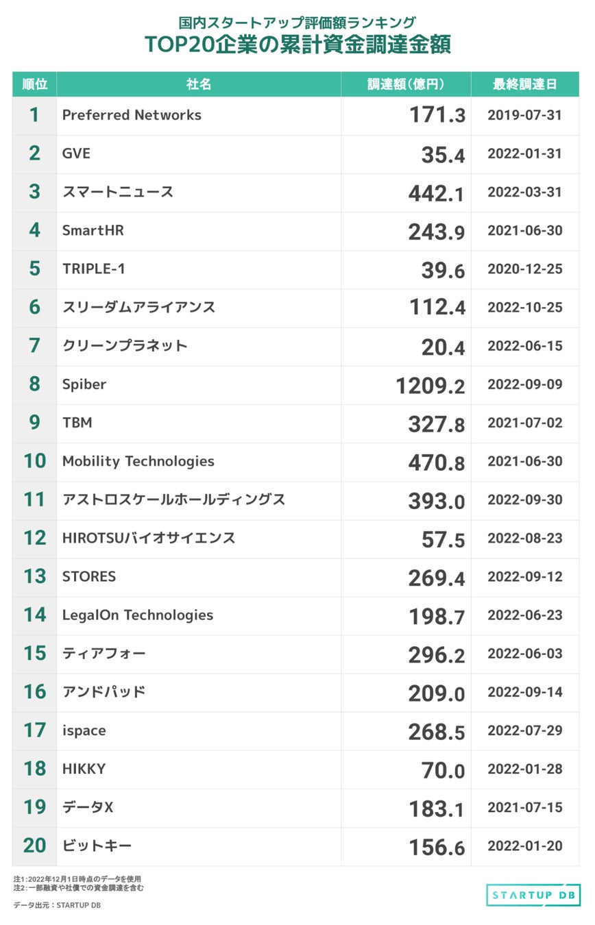 【STARTUP DB】調査結果 国内スタートアップ評価額ランキング最新版(2022年12月)