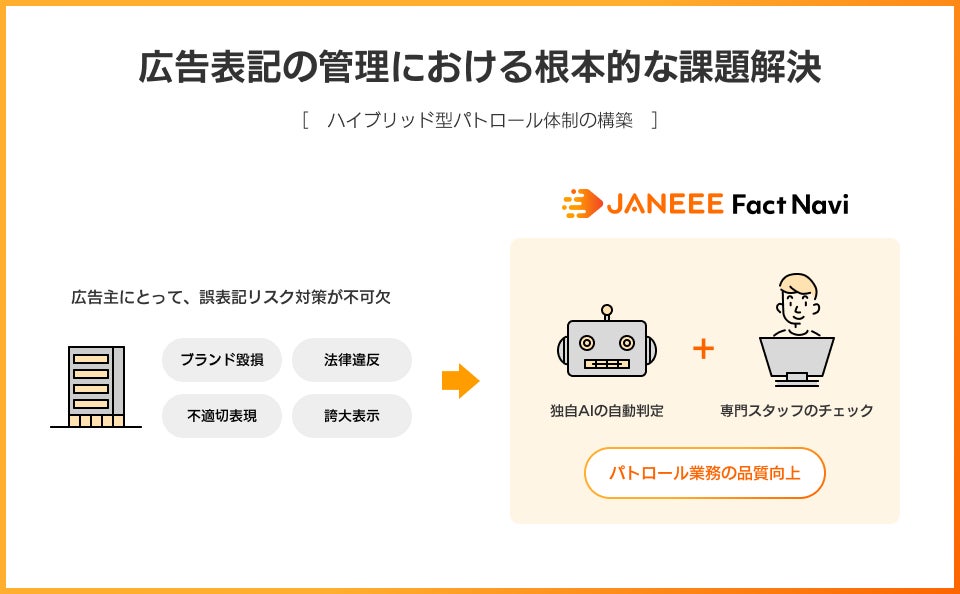 JANEEE Fact Naviは、JANetの広告審査を通じて蓄積した知見を学習させた独自のAIが、広告表記をチェックします。専門スタッフによる目視を組み合わせる事で「ハイブリッド型パトロール」体制を構築し、品質管理の改善につなげています。