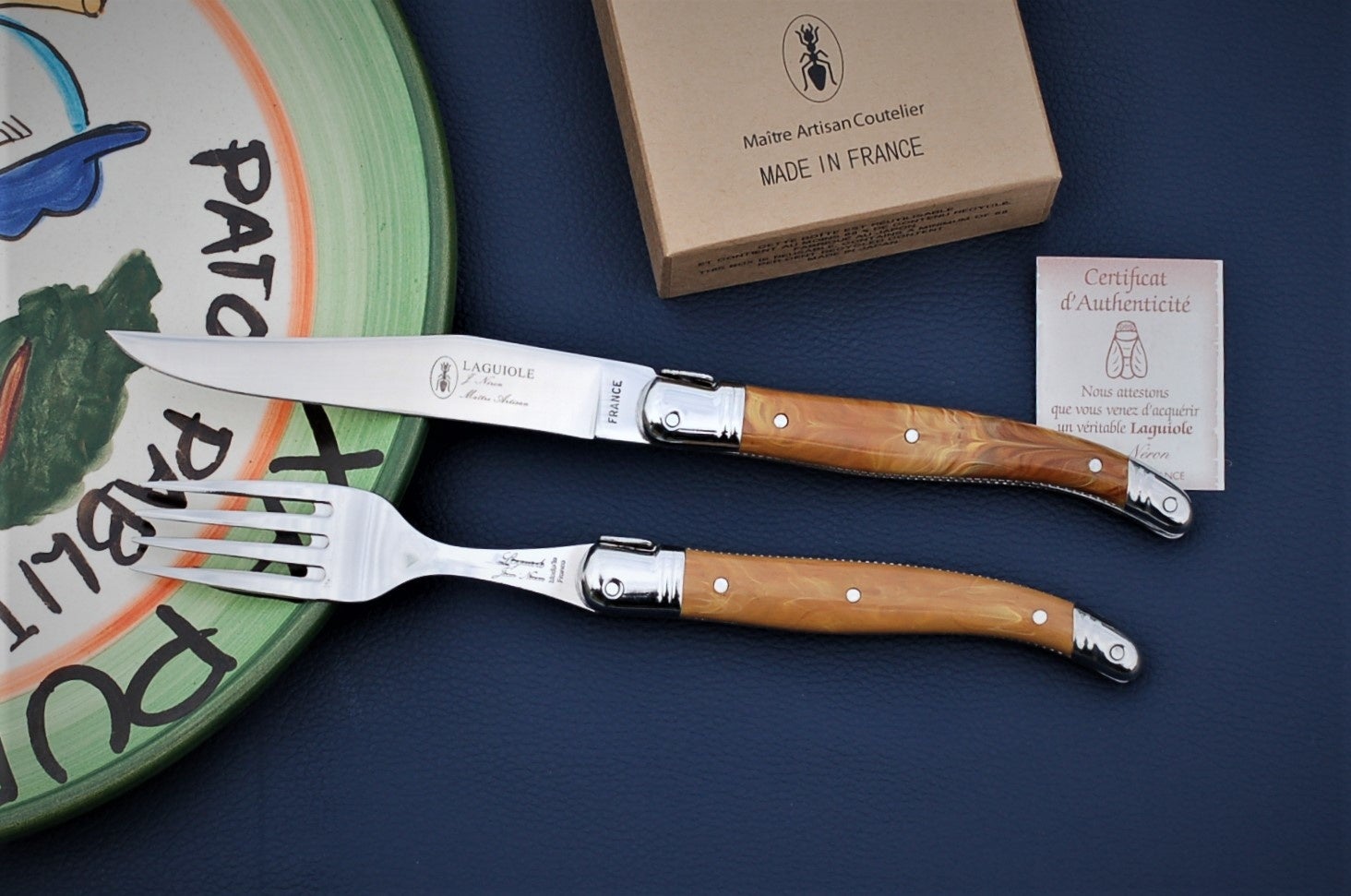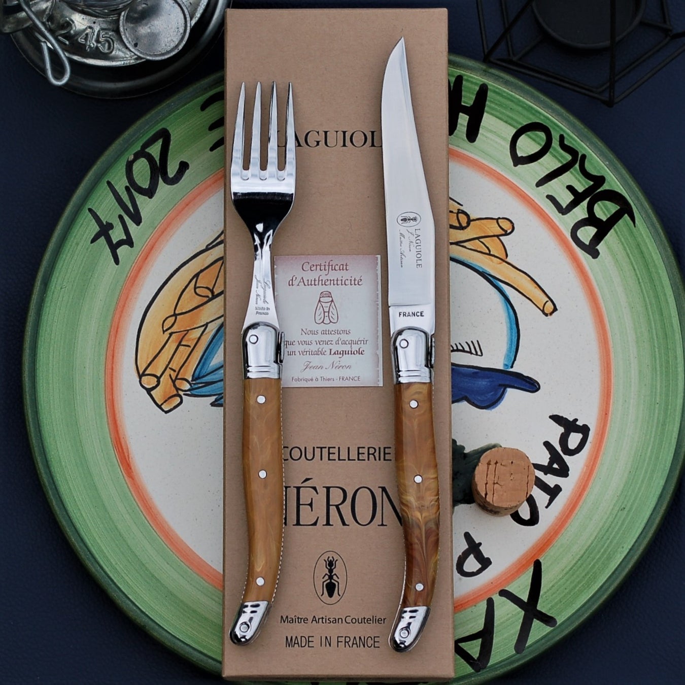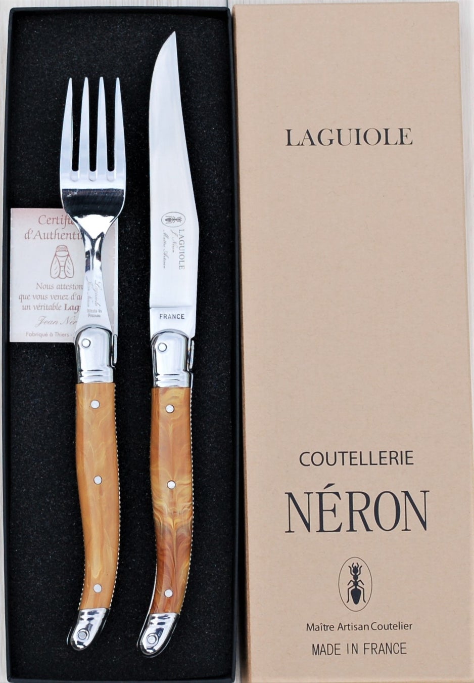 ライヨール ABS ハンドル 2.5mmディナーナイフ 2.0mmフォークセット ギフト箱入り フランス製 NERON オリーブ マーブル ¥16,800 (税込)