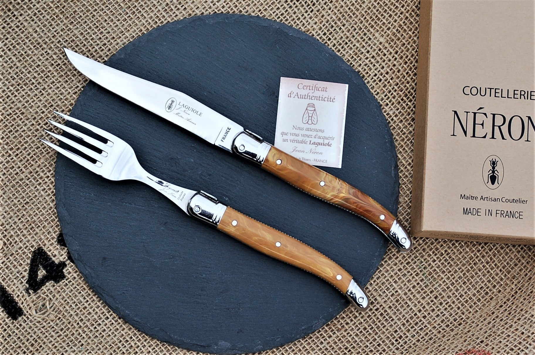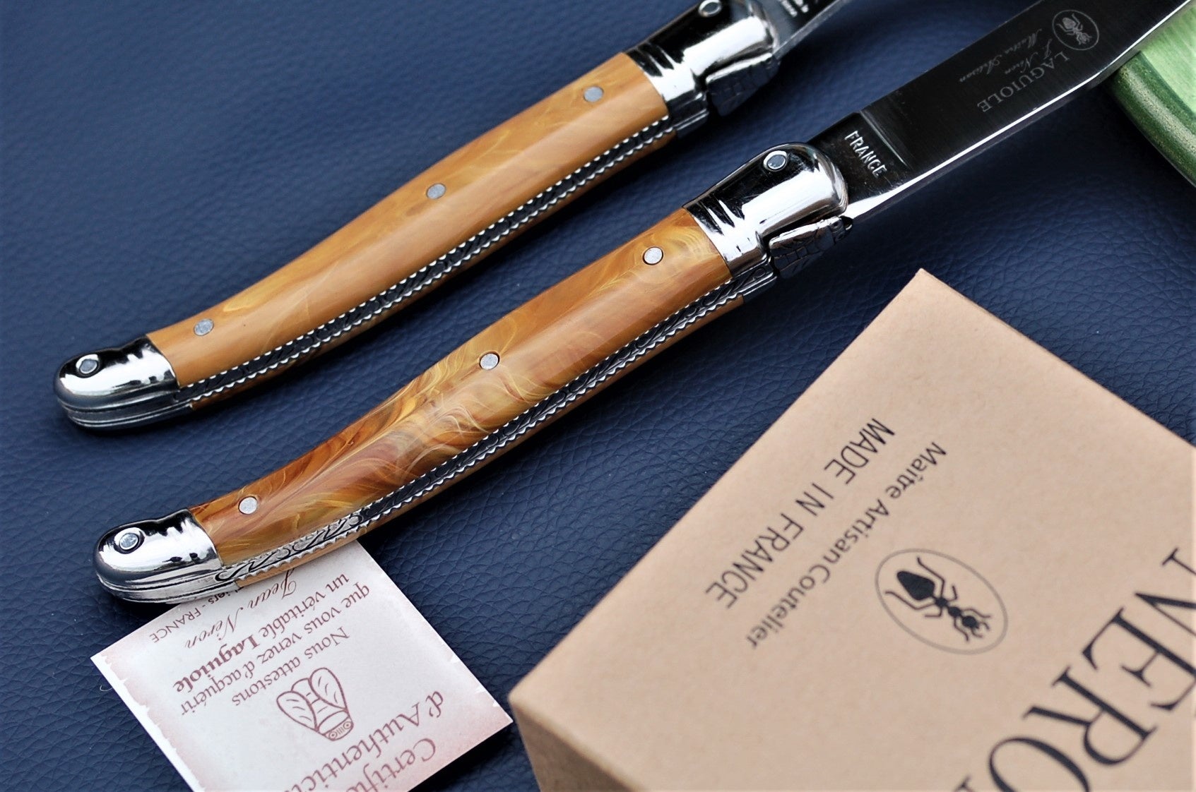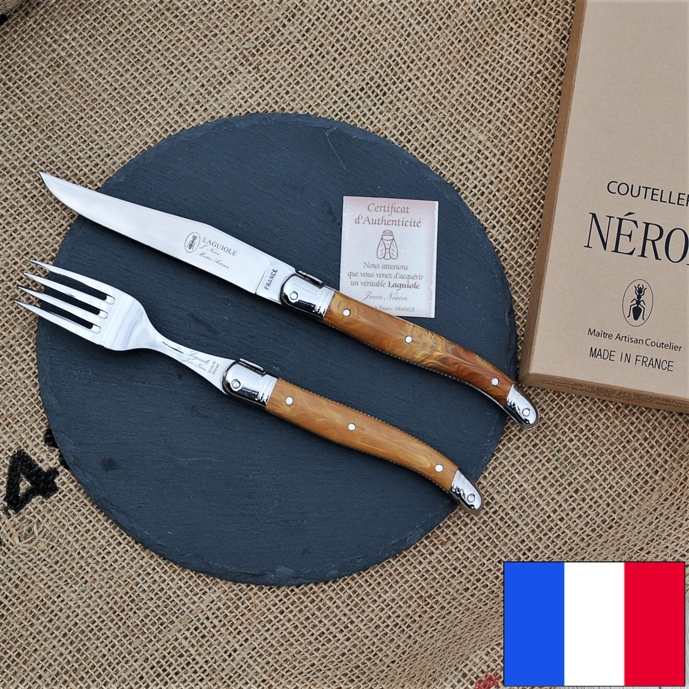 ライヨール ABS ハンドル 2.5mmディナーナイフ 2.0mmフォークセット ギフト箱入り フランス製 NERON オリーブ マーブル ¥16,800 (税込)