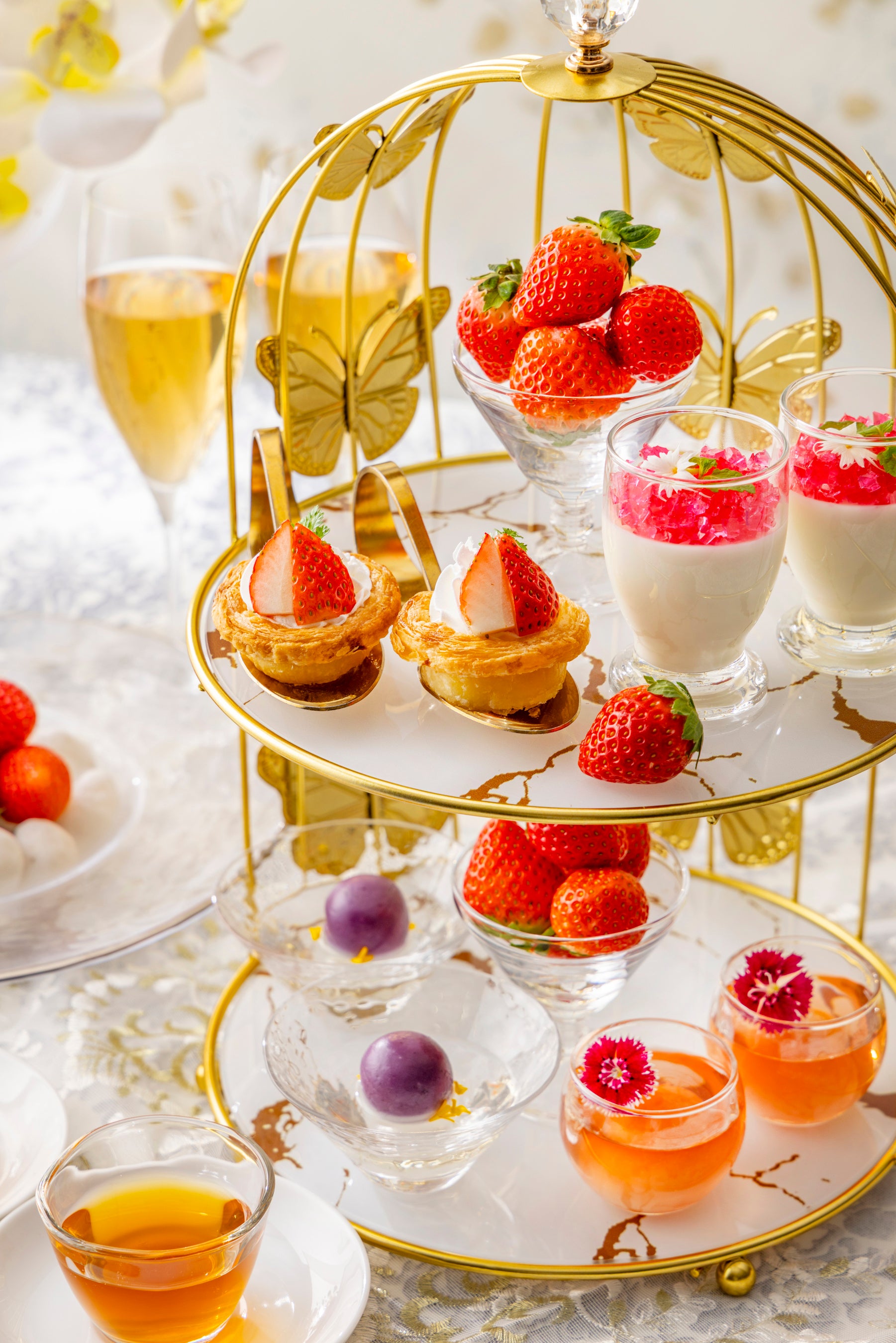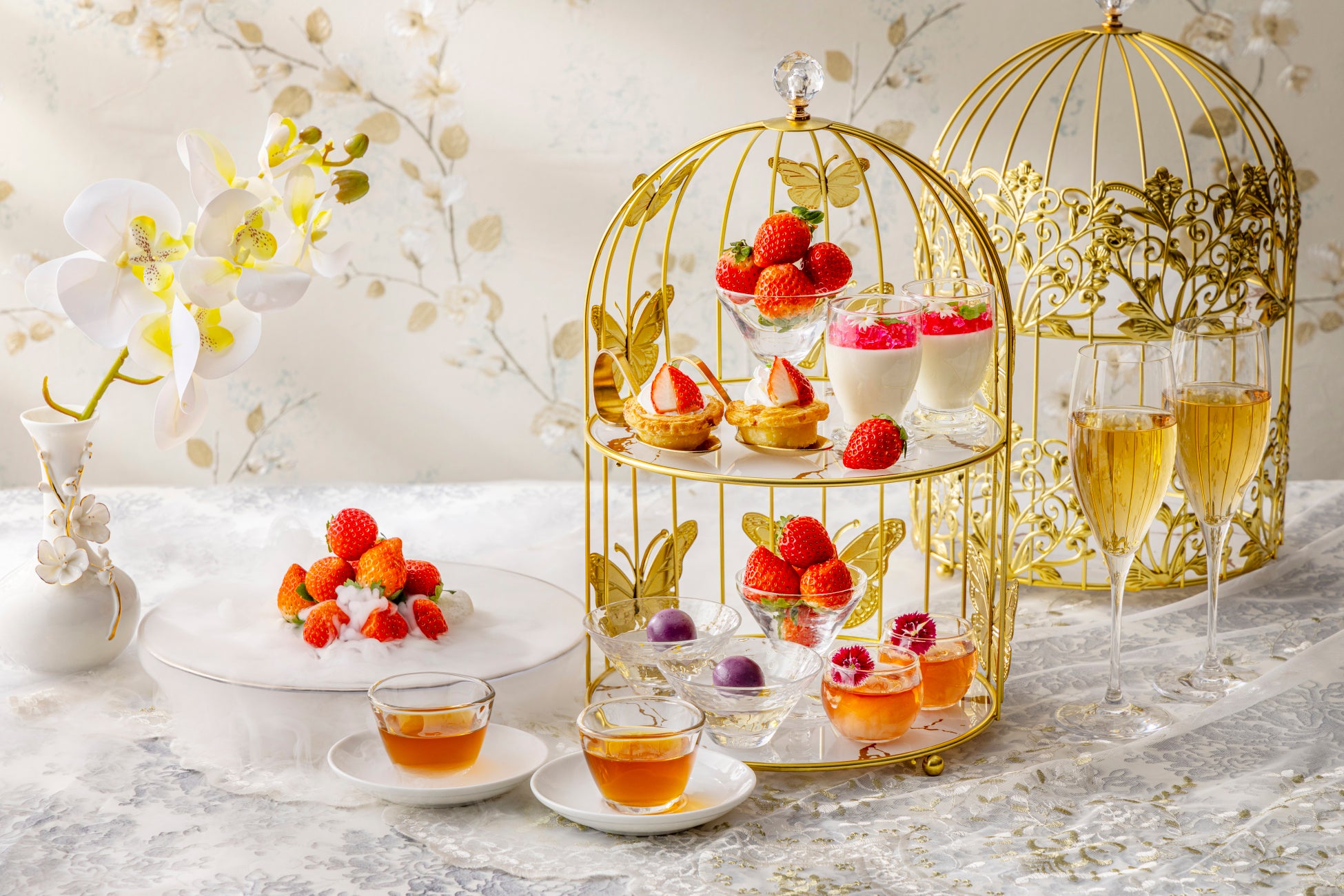 優雅なお食事の締めくくりには、4種類のデザートとフレッシュ苺を鳥籠風アフタヌーンティースタンドに美しく並べてご提供いたします。甘酸っぱく華やかな香りの山査子を用いた「ライチ入り山査子酒のゼリー」や紫芋を練りこんだ皮で黒ゴマ餡を包み込んだ白玉団子に金木犀のジャムを用いたシロップを添えた「金木犀香る黒ゴマ餡の白玉団子」、「ストロベリーエッグタルト」などに加え、フレッシュ苺は素敵なサプライズ演出と共にお楽しみいただけます。※仕入れ状況により演出をご提供できない場合もございます。
