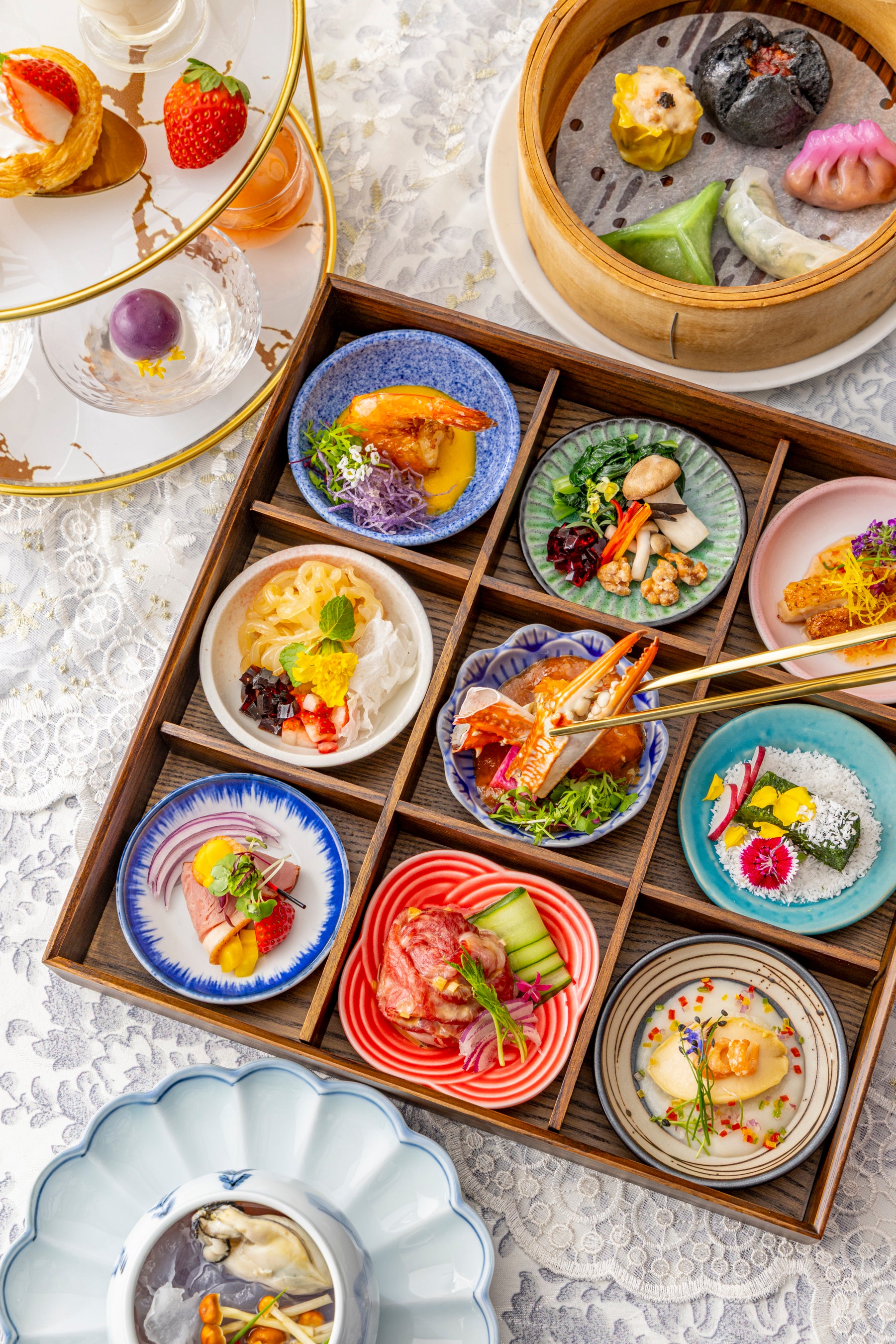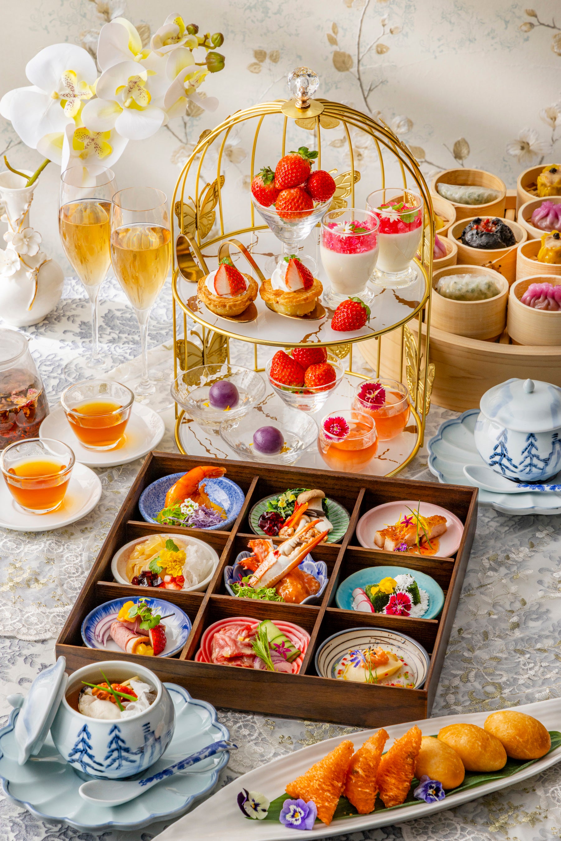 優雅なアフタヌーンティースタンドには4種類のスイーツとフレッシュ苺。極上コラーゲンスープを含む10種類のシェフズスペシャルとお代わり自由の点心がセットになった“チャイニーズアフタヌーンティー”