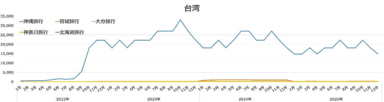 以下は、調査した8ヶ国・地域*の「沖縄旅行」、「宮城旅行」、「大分旅行」、「神奈川旅行」、「北海道旅行」の検索数の合計値をまとめたものです。これら5県は、2025年10~11月の都道府県別宿泊者数トップ20において、2024年と比較して東京・大阪・京都など主要都市となる観光地以外で宿泊者数が多かった県です。オーバーツーリズムを避け、日本の「地方ならでは」の魅力を求める観光客が増えたと考えられます。