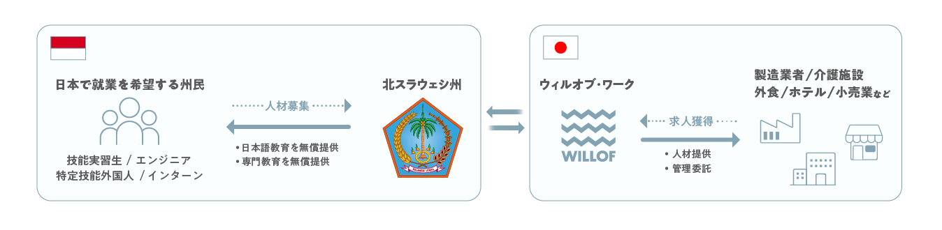 また、技能実習制度および特定技能制度を通じて来日する外国人の中には、研修費用・入国手続き費用・渡航費によって多額の借金を負って来日する外国人も多く、社会問題となっています。本取り組みにおいて北スラウェシ州政府は、求人に応募する州民に対し日本語教育および必要な専門教育を無償で提供することでZERO DEBT(借金ゼロ)での入国を実現し、金銭的な負担を軽減する座組を構築します。北スラウェシ州と連携し、2025年3月末までに1,000名の入国支援を目指します。
