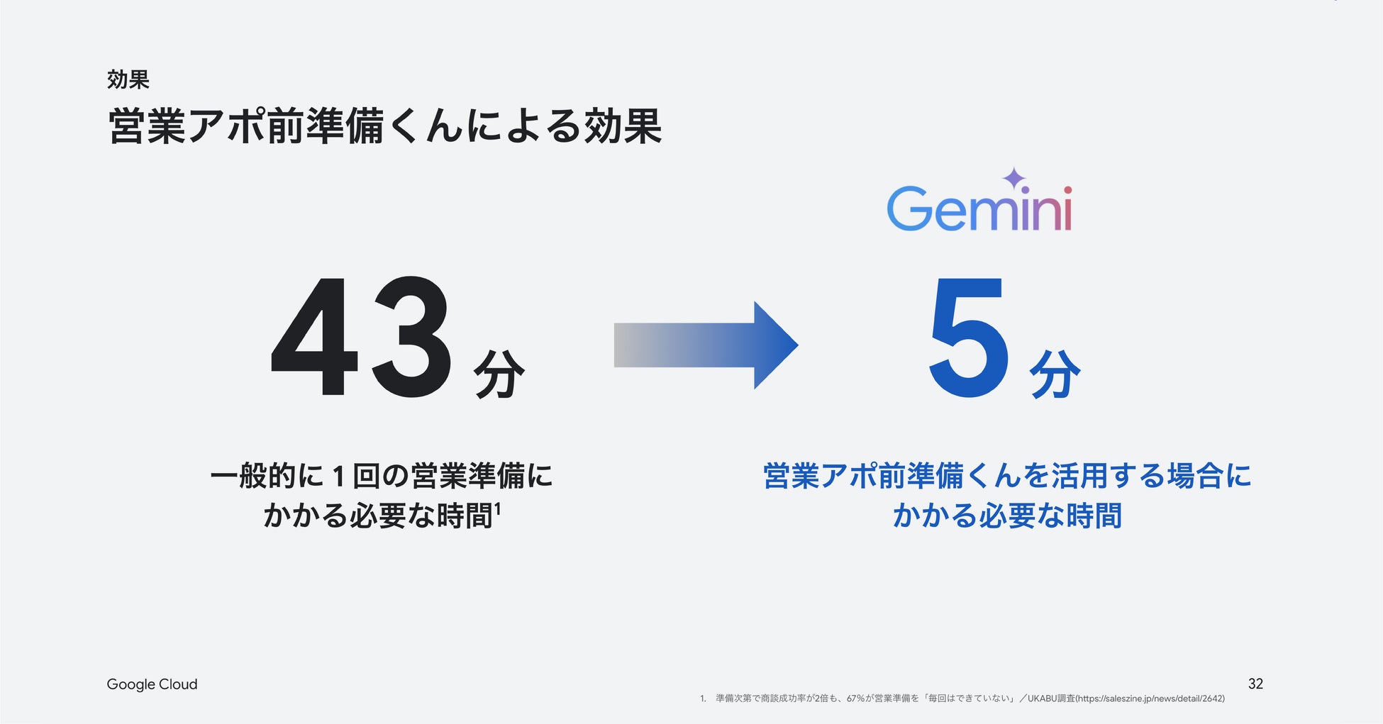 「営業アポ前準備くん」の利用により、1回の営業準備にかかる必要な時間は43分から5分まで、1/8の短縮に成功しました。